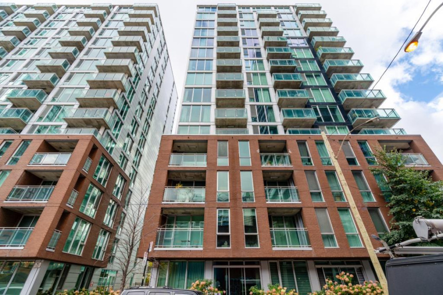 公寓位于大楼第九层,私密性与视野兼备。室内建筑面积约 781 平方英尺,采用大面积落地窗设计,采光极其充足,两面窗景可欣赏市中心全景,营造开阔明亮的居住氛围。室内以仿木地板为主,空间布局方正,开放式厨房与客厅连为一体,现代感十足,非常适合都市白领、小家庭或投资自住。厨房配备中岛与不锈钢电器,烹饪与用餐空间功能分明,整体设计简洁利落。