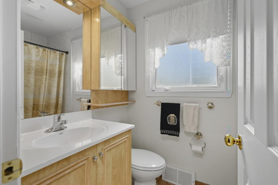 主层采用典型的 cross-hall 格局,玄关铺设陶瓷地砖,正对客厅与餐厅。客厅采光充足,空间方正,与餐厅区域相对分区,适合正式宴客或家庭活动使用。家庭厅设有木质壁炉,并通过玻璃门直通后院露台,是日常生活与休闲娱乐的核心空间。厨房面积宽敞,设有独立用餐区,大窗引入充足自然光,整体明亮舒适。主层还设有洗衣房与化妆间,生活动线合理。