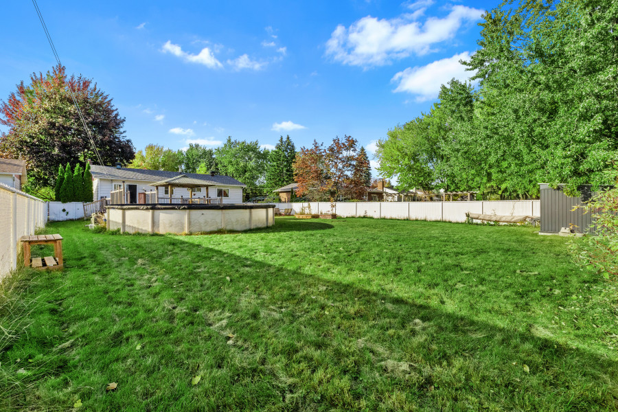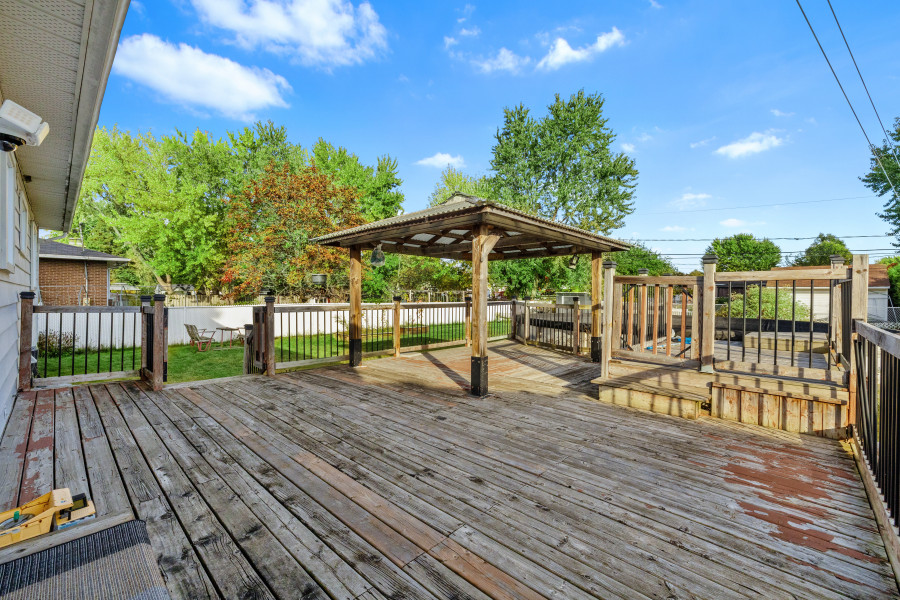 - Large backyard with wooden deck, gazebo, pool, and expansive lawn.