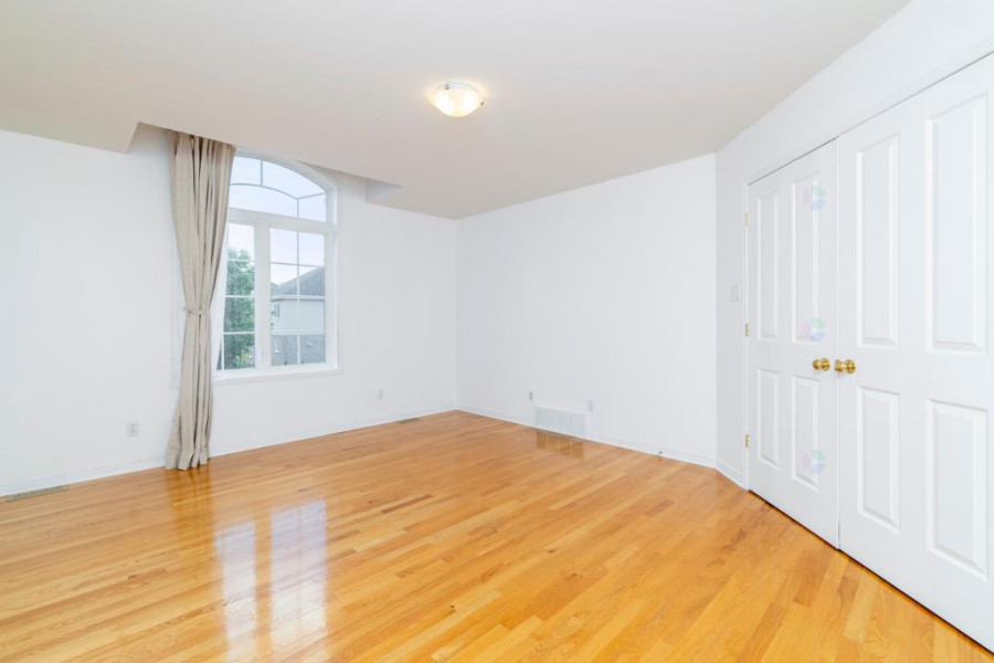 二楼设三间卧室与一间宽敞全浴。主卧面积充裕,配有独立步入式衣帽间及大型窗景;浴室以黑灰色瓷砖铺陈,配备独立淋浴与大型按摩浴缸,空间感十足。其余卧室均为实木地板,采光良好,可作儿童房或工作区,灵活多变。