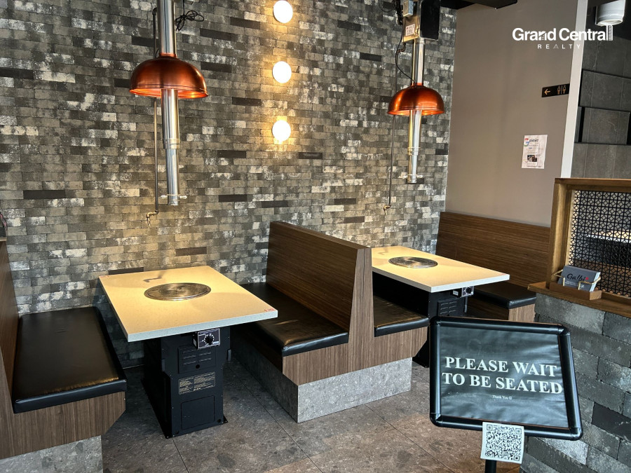 The restaurant features brand-new equipment including 11 individual gas BBQ tables with dedicated hoods in a 1,402 sq. ft. space designed for efficiency. Liquor license until midnight and convenient street parking for guests.