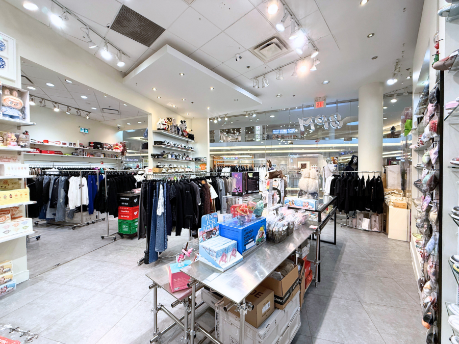 Approximately 1,000 sqft, this highly desirable corner unit features expansive floor-to-ceiling glass storefront windows, providing outstanding visibility and natural light. The interior offers a functional two-section layout, including 3 fitting rooms, 1 storage room, stylish track lighting, and a modern retail setup, making it truly ready to operate.