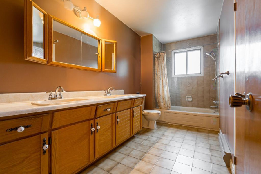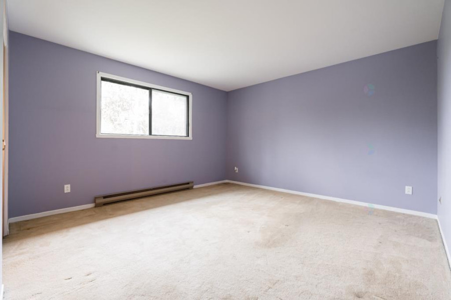 楼上为三间卧室与一间浴室。主卧地毯铺设,空间宽大,另两间次卧则铺设实木地板(parquetry),皆采光充足。浴室配有双洗手台与标准浴缸,实用性强,满足家庭日常所需。