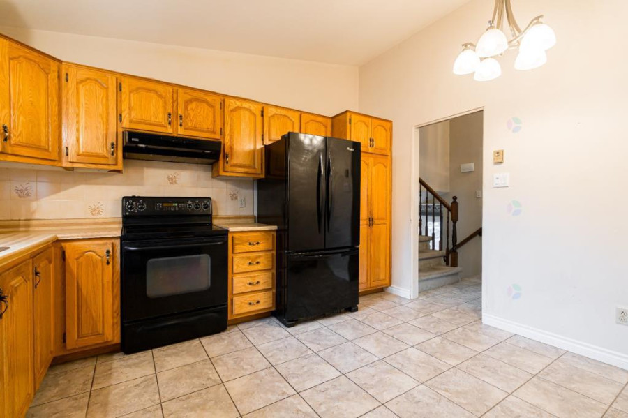 主层设有舒适的客厅、餐厅与厨房。客厅与餐厅均铺设实木地板,宽敞明亮。厨房采用实用布局与陶瓷地砖,功能齐备,配有黑色电器。整体空间感良好,非常适合家庭聚会与日常生活。