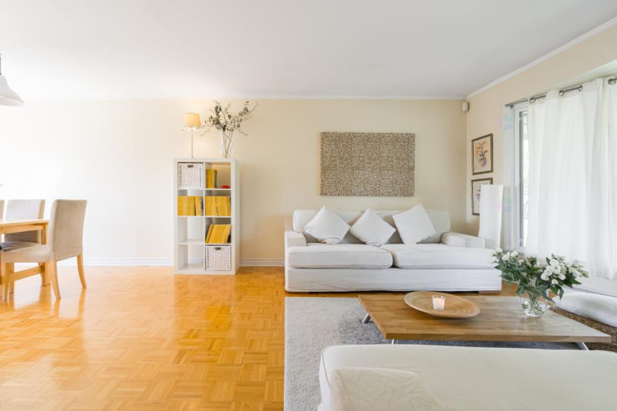 主层布局方正合理,设有前厅、大客厅、餐厅与厨房。客厅与餐厅采用传统实木拼花地板,南北通透,光线明亮;厨房铺设陶瓷地砖,橙色墙面点缀木纹橱柜,配有洗碗机与微波炉等多种设备,实用且富有生活气息。