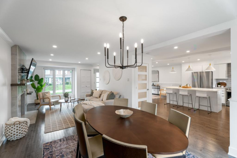 主层空间开阔,采光极佳,铺设高档实木地板,客厅、饭厅与家庭厅之间连贯通透。厨房为开放式现代设计,设有中心岛、嵌入式家电与宽敞备餐区,极适合家庭聚餐与日常待客。壁炉区更添温馨气氛,粉卫与通往后院的推拉门带来极高使用便利。