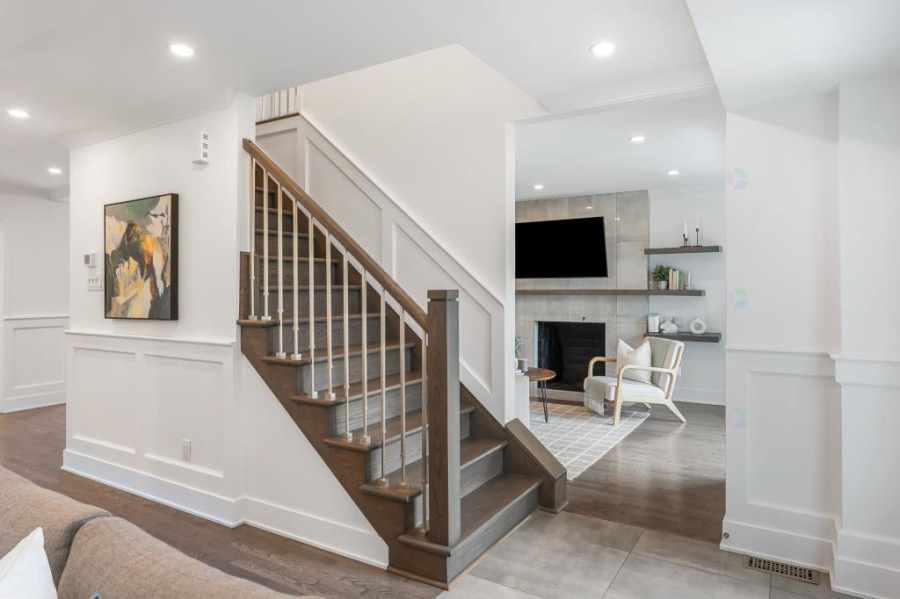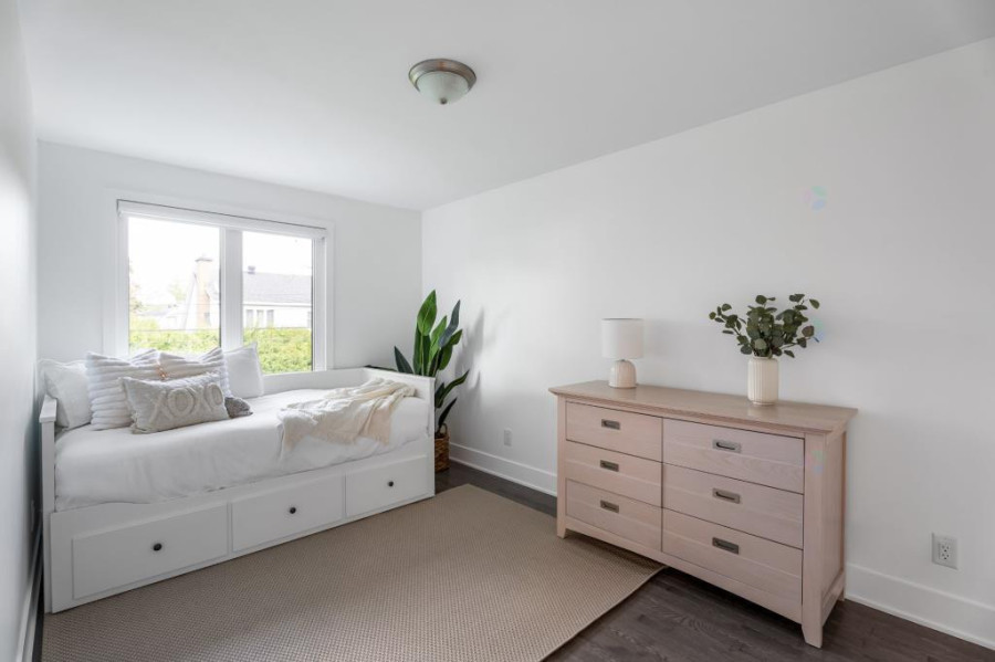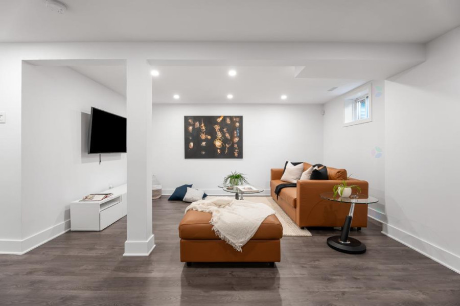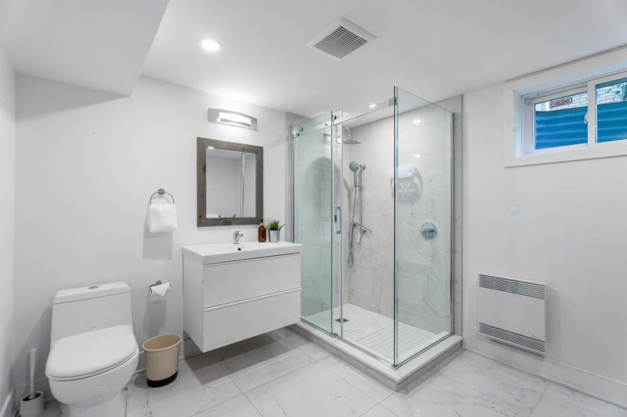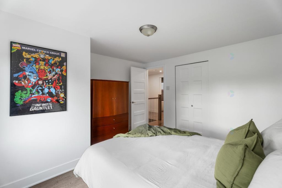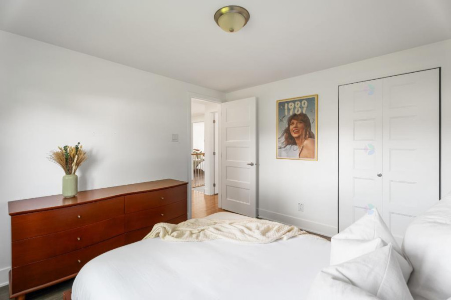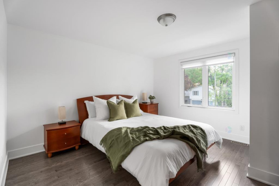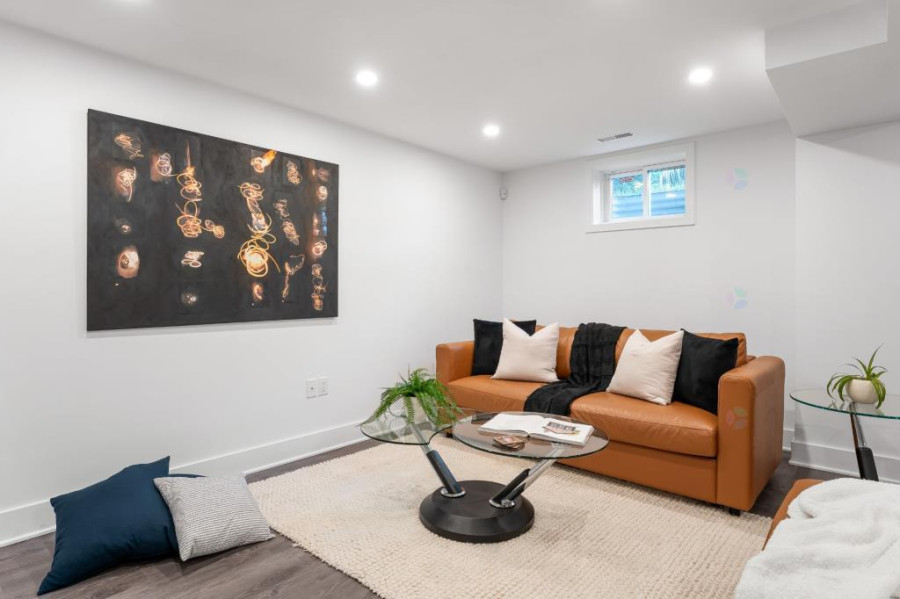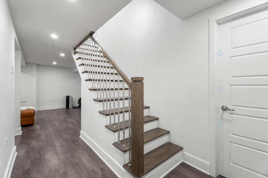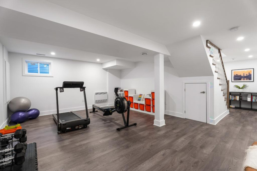 二楼设有四间宽敞卧室,主卧套房内附翻新卫浴,配备玻璃淋浴与质感瓷砖。其他三间卧室皆为标准尺寸,明亮整洁,适合儿童房、书房或长者房。楼上另设完整客卫一间,服务全家起居所需。地下室为全装修状态,设有大型娱乐室、第三间完整卫浴(含洗衣设备),以及充足储物空间,灵活用途涵盖健身房、办公区或亲友留宿使用。地板采用耐磨层压材料,维护简便。
