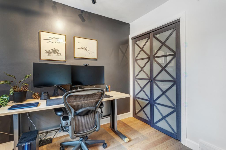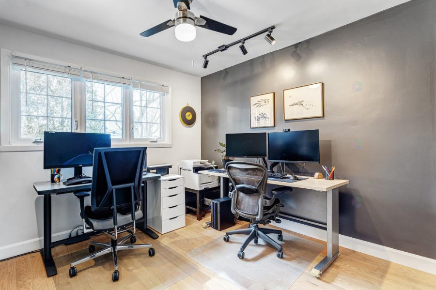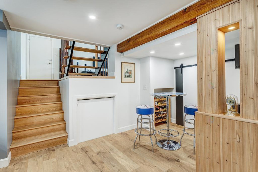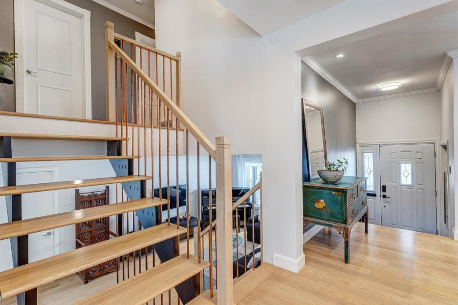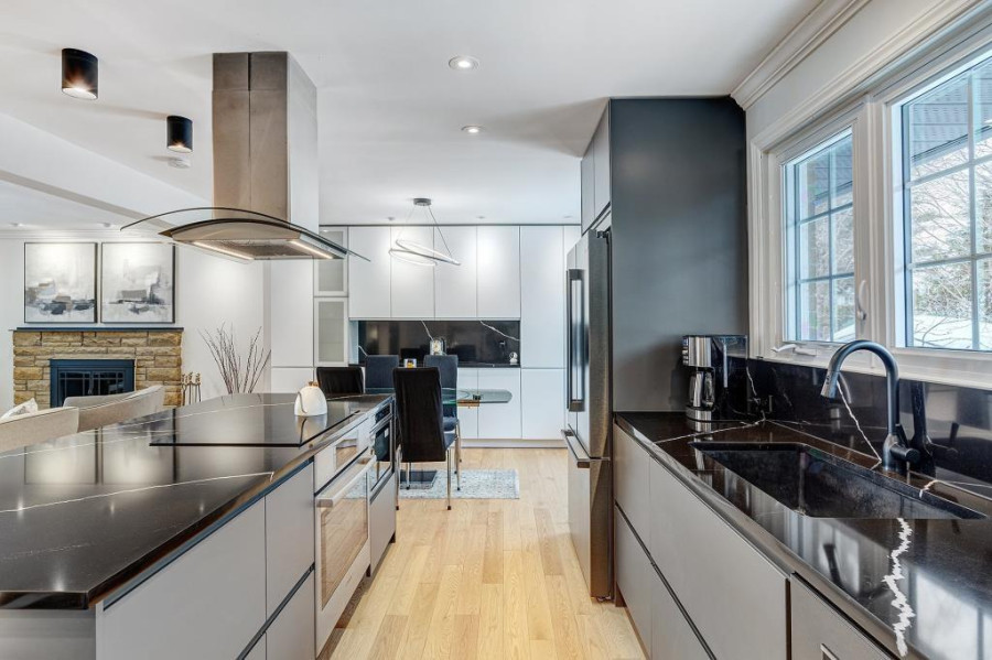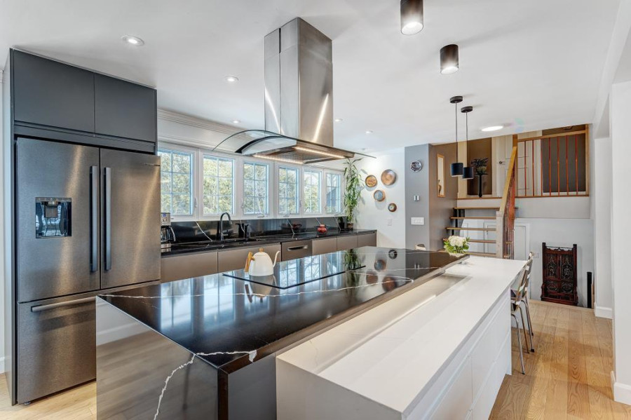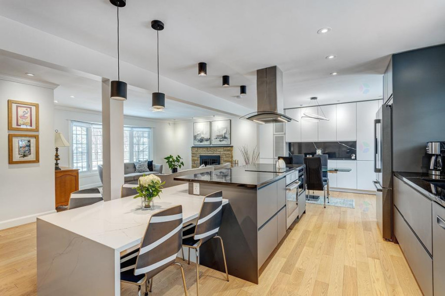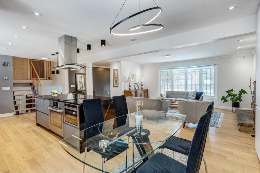 主层空间通透开阔,设有开放式客厅、餐厅与现代化厨房,连贯布局适合家庭日常互动与接待宾客。厨房采用高级橱柜与岛台设计,电器配置齐全,采光极佳,南向窗景带来温暖日照。客厅配有壁炉,营造温馨氛围,现代灯具与简洁装潢提升整体美感。