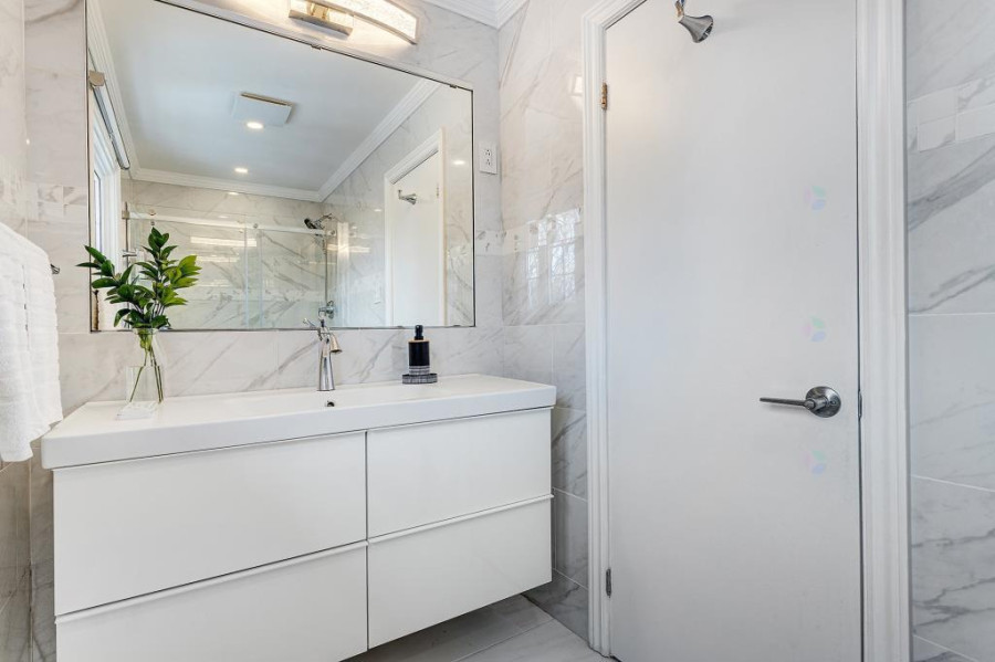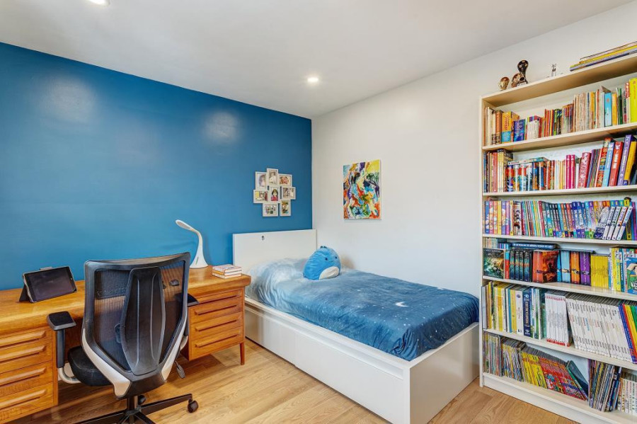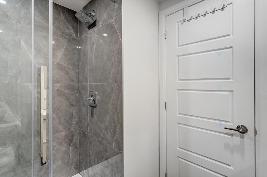 卧室区域位于上层,主卧与两间次卧皆为实木地板,空间宽敞明亮,储物充足,适合家庭成员各自独立生活。主浴采大理石墙面与玻璃淋浴间,极具设计感与功能性。额外化妆间设于地面层,方便访客与日常使用。地面层家庭厅为舒适放松之地,可作为影音区或儿童活动空间,另设一间办公室/工作室,与庭院有良好连接。地下室设有额外卧室、家庭厅、卫浴与洗衣间,空间灵活,适合访客或长辈居住,整层以复合木材与瓷砖铺设,明亮整洁。