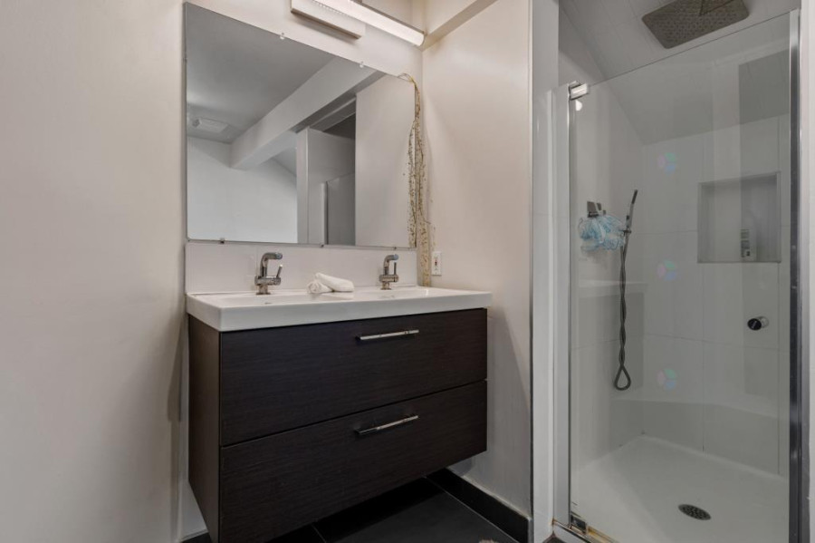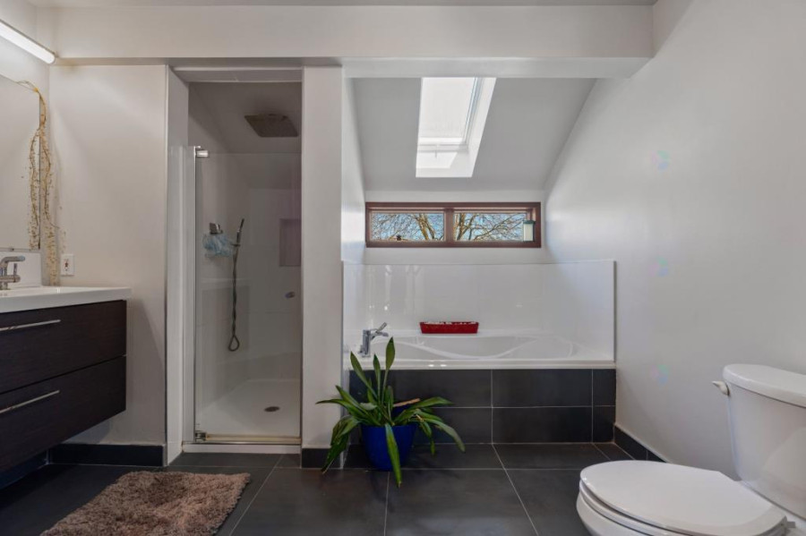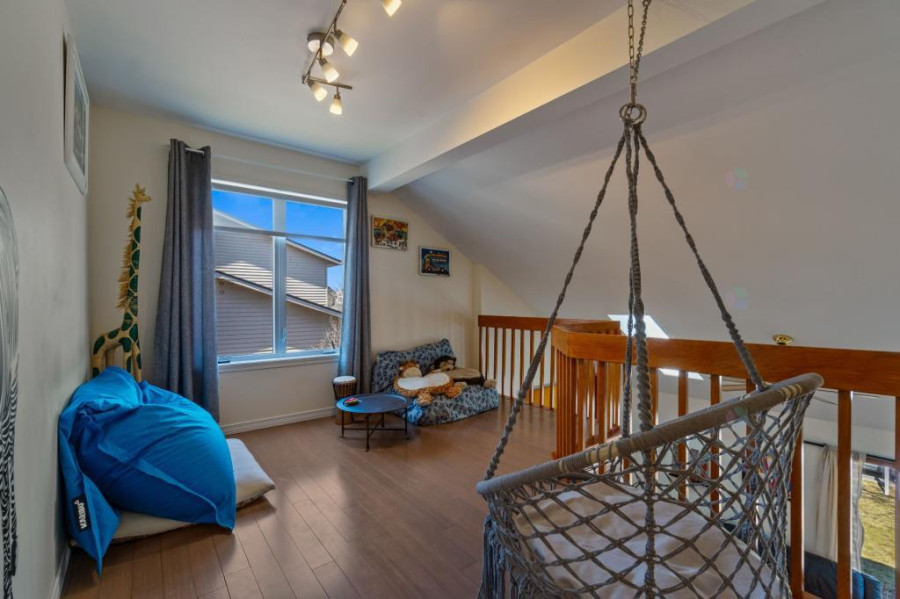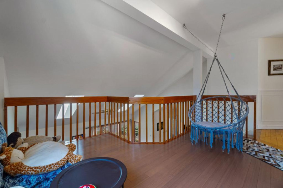 二楼共设三间卧室与一间浴室,其中主卧面积宽敞,采光良好。浴室于2019年整修,双洗手台搭配宽大镜柜,提升使用便利。中段夹层为开放式阁楼空间,可作游戏区、书房或额外卧室,设有天窗,视野开阔,空间灵活多元。