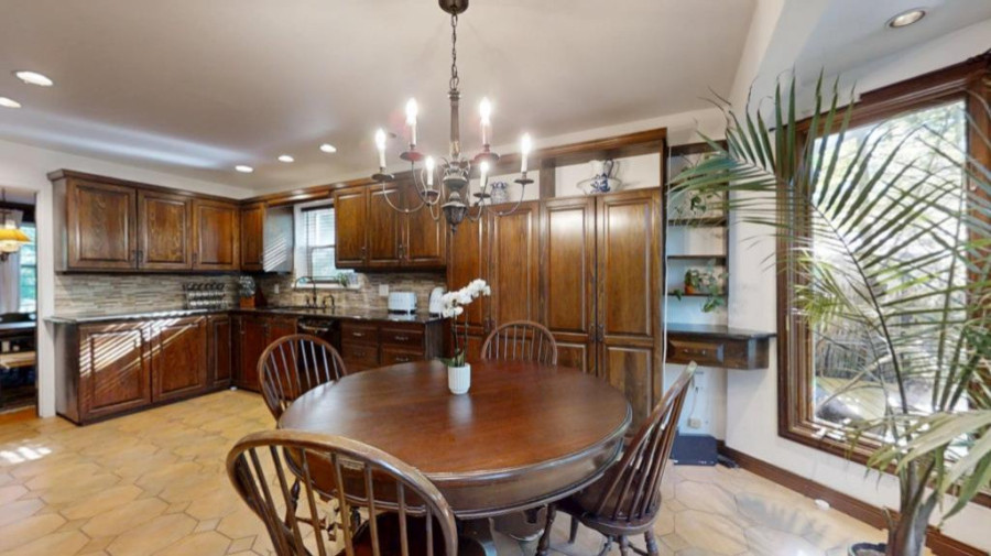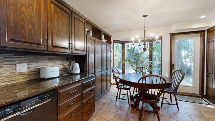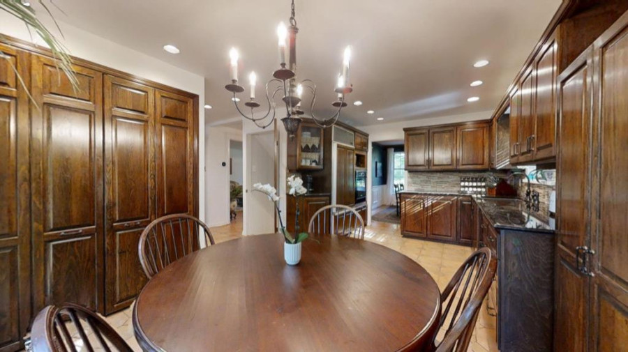主层格局大气,以深色实木地板为主,设有双厅与正式餐厅,整体空间通透。客厅配有原石壁炉,风格温馨古典。餐厅紧邻厨房,厨房采用木质橱柜系统,配有大理石台面与五组全高收纳柜,并设独立早餐区(kitchenette),透过弧形窗户可欣赏后院绿景,是家庭每日起居的温暖核心。家庭厅位于主层后段,设有横梁吊顶与壁炉,展现传统风格氛围,并设玻璃门直通露台与庭院,动静分区清晰。主层另设有洗手间与通往双车库之内通式玄关,便利实用。