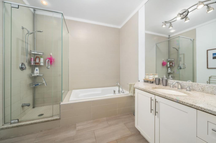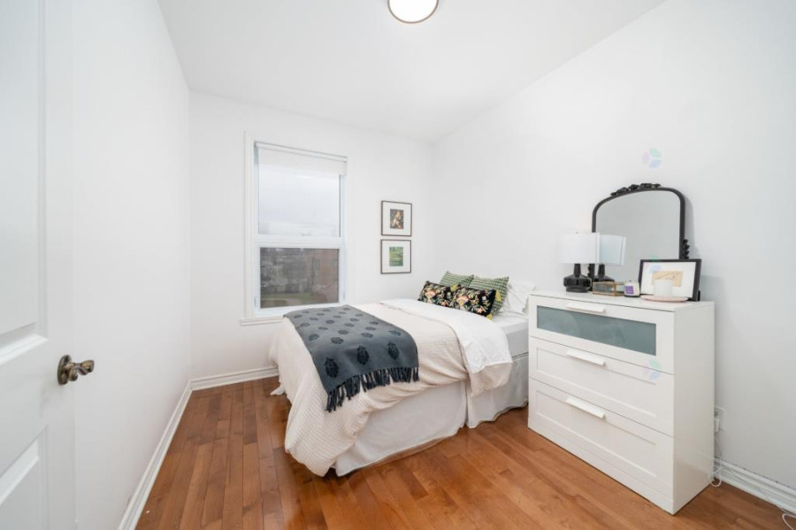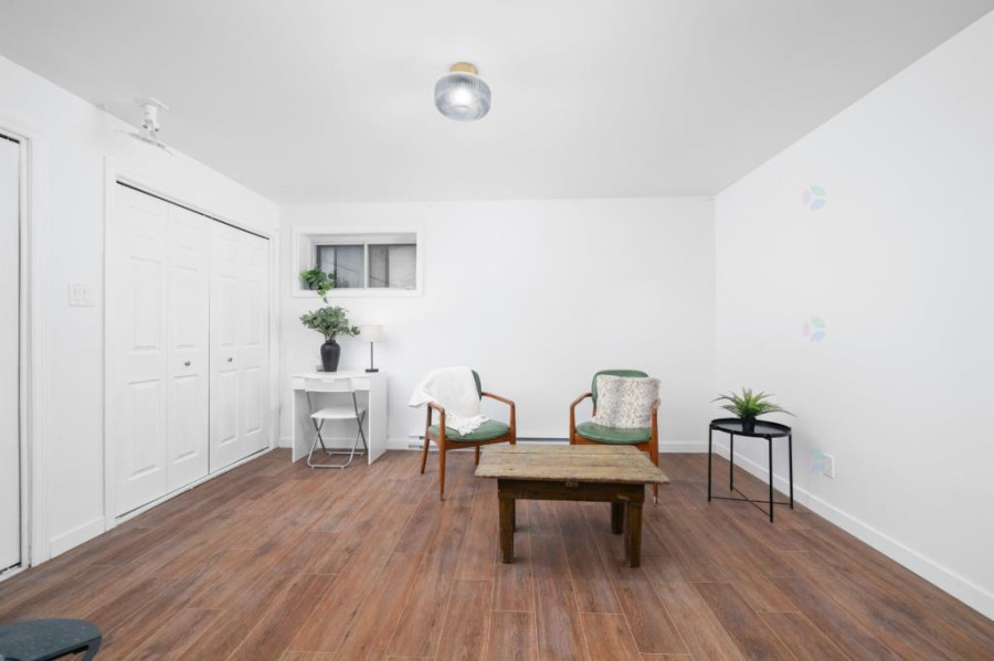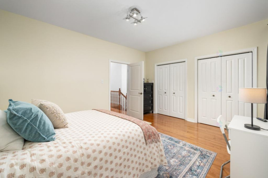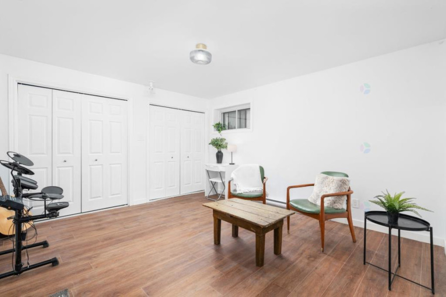 二楼设有三间卧室,主卧空间宽敞,带双窗设计与大型衣柜。次卧格局方正,适合作为儿童房、书房或多功能空间使用。楼层浴室采现代装修,含独立浴缸与淋浴间,搭配石质洗手台与双镜面柜体,整体整洁大方。地下室为成品空间,设有家庭娱乐区、洗衣区与直通车库通道,地面铺设复合木地板,功能多样。附带砖墙围栏的私密露台,维护简单,适合日常休憩或亲友聚会使用。室内配有中央热泵系统与空气交换器,四季舒适节能。