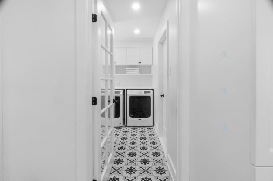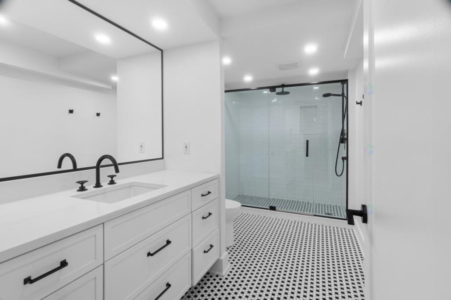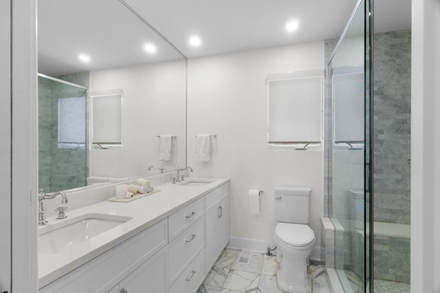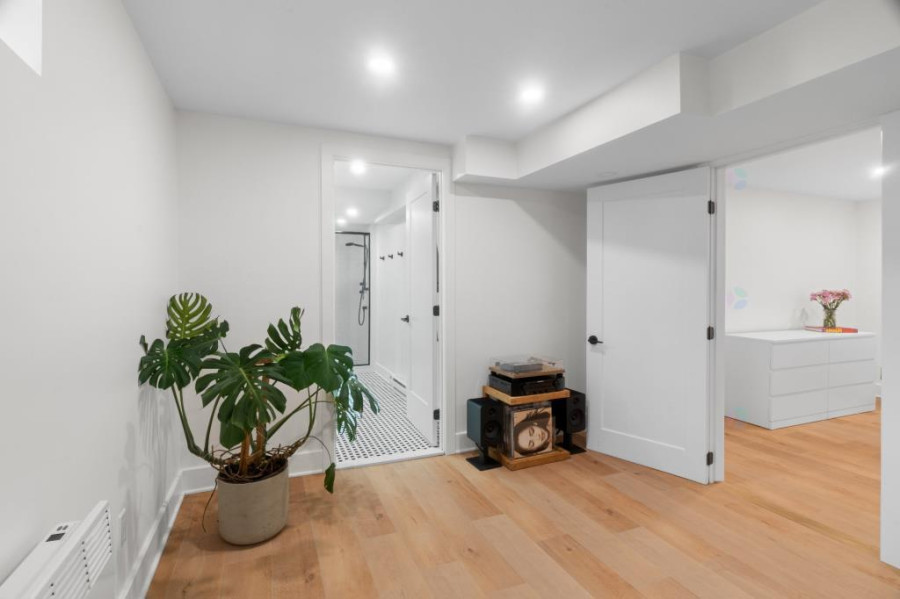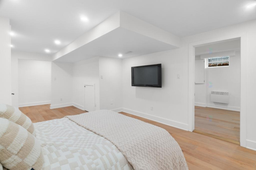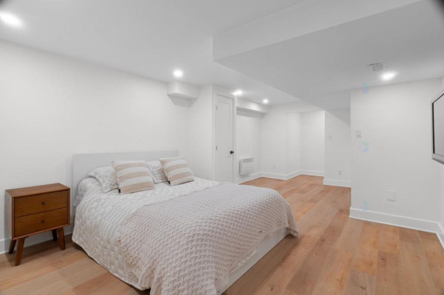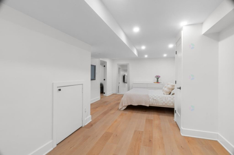 二楼设有四间卧室与两间完整卫浴,主卧带有定制步入式衣帽间及附双洗手台、玻璃淋浴间的卫浴套间,格局舒展、采光良好。其他三间卧室皆具实木地板,空间灵活,适合作为孩童房、书房或访客使用。全屋采用优质洁具与木工饰面,细节质感俱佳。地下室为全功能完成空间,设有第五间卧室、一间卫浴、储物间、起居区域及独立工作区,配备中央吸尘系统、环形照明与冷暖气独立控制。地板与墙面全部更新,风格延续主层现代简洁风,适合多代同堂、家庭影院、健身房或长辈房等多样用途。