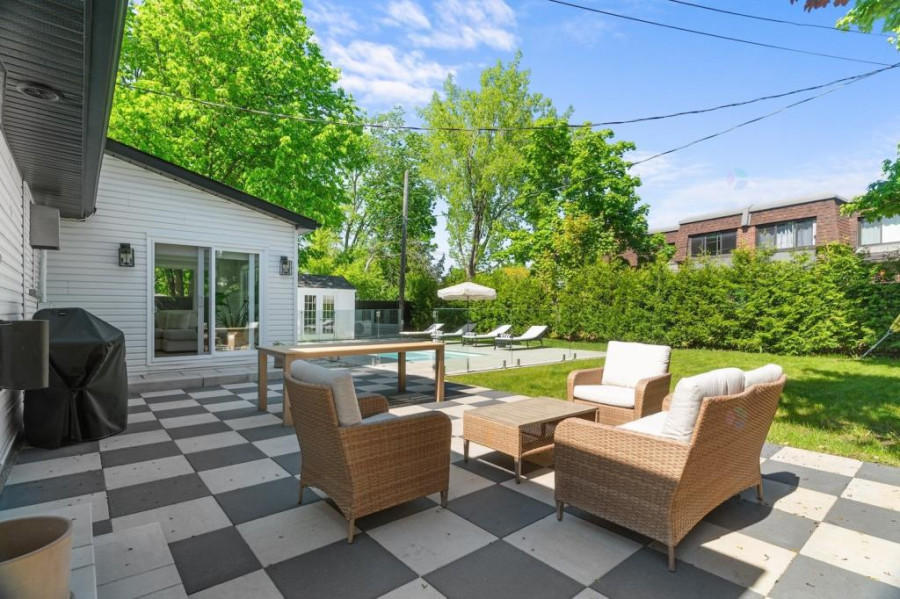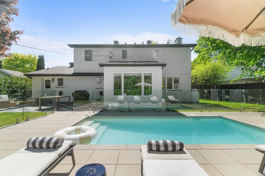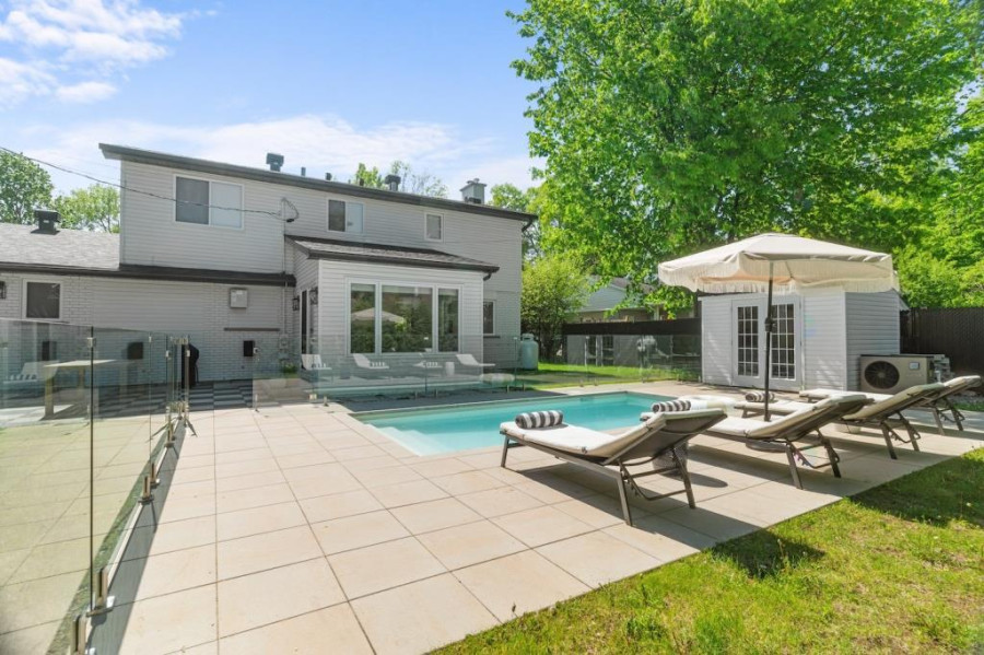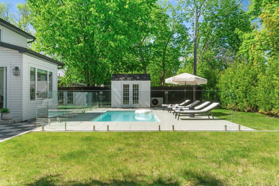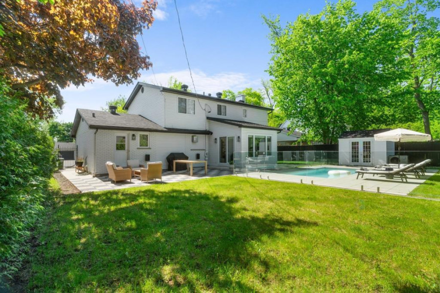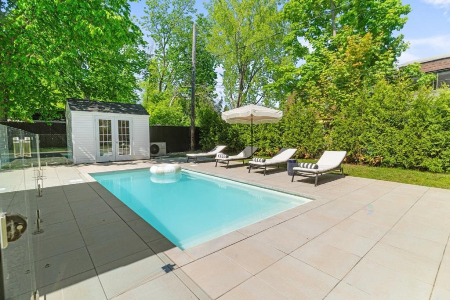 后院为平整地块,2021年新建混凝土入地式泳池,周围硬化铺砖,绿植环绕,兼顾美观与实用。车道可停四车,连通前院车库,整体庭院设计兼具美感与功能性。步行可至Beaurepaire火车站、REM快线与Beaconsfield图书馆,生活、交通与教育资源优越。