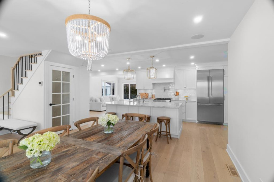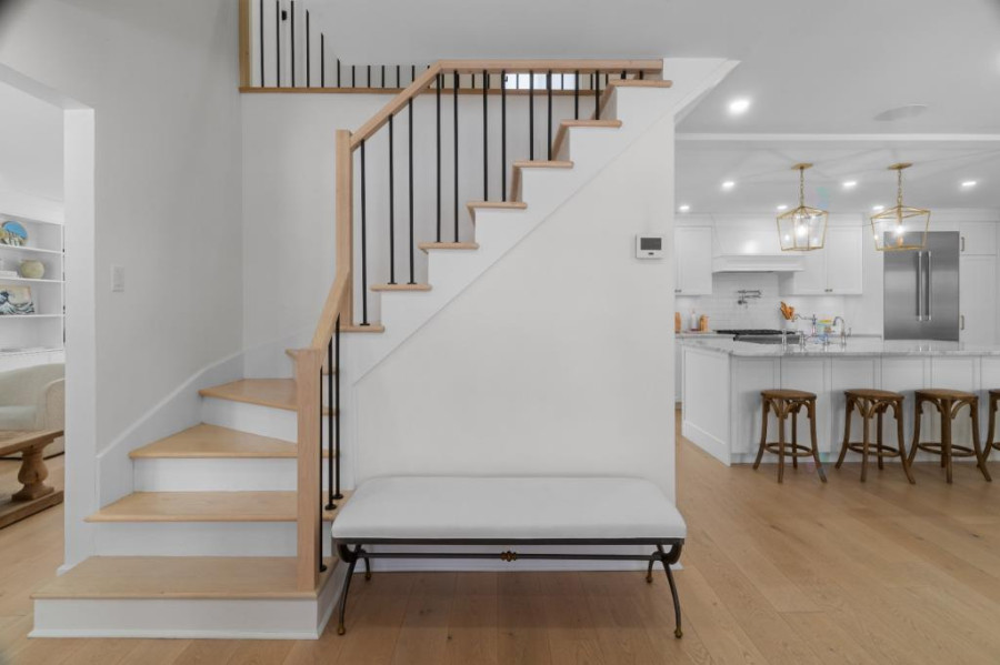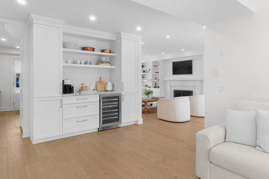 主层采用开放式布局,客厅与餐厅空间贯通,配有白橡木实木地板、大面窗与嵌入式照明,营造通透明亮的生活氛围。厨房配置全套高端Thermador品牌电器,中心岛台宽敞实用,并设有独立咖啡酒水区(含酒柜),适合家庭日常与亲友聚会场景。主层另设洗衣间、客卫与玄关储物空间,细节到位,布局合理。
