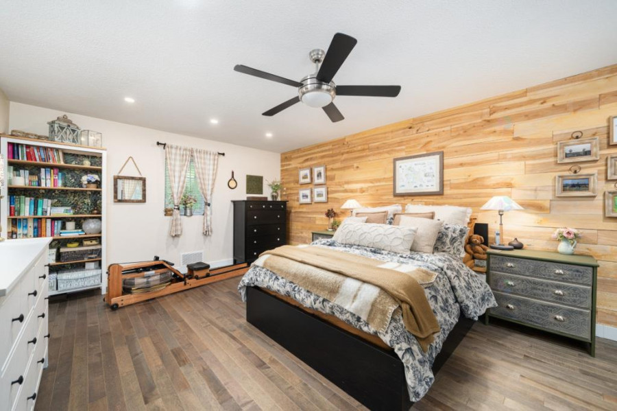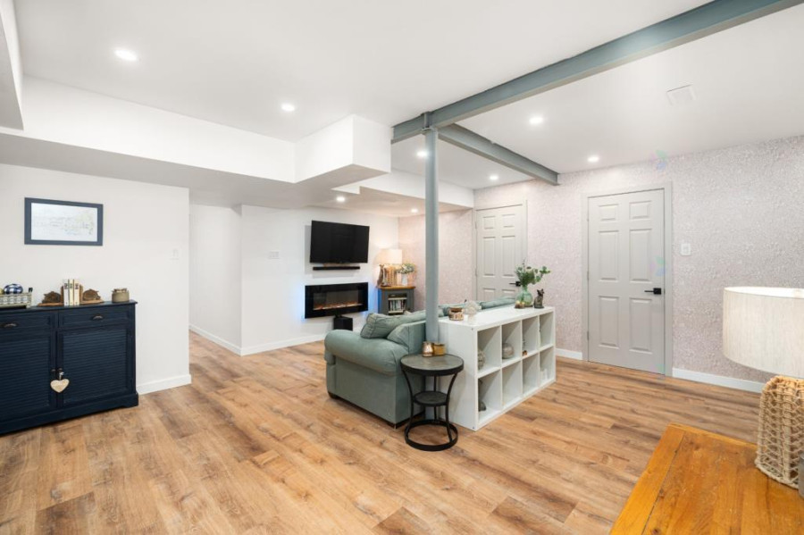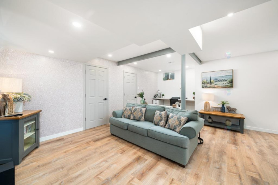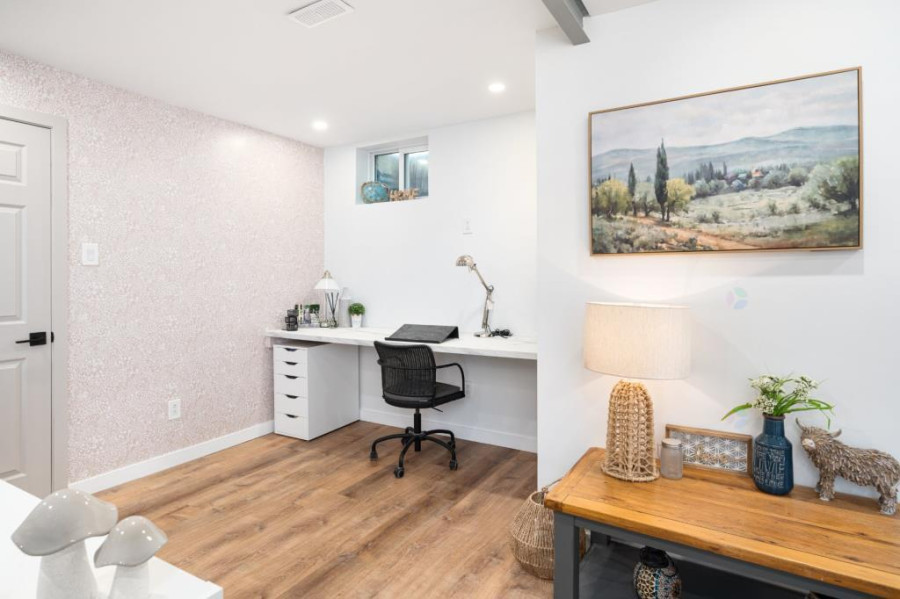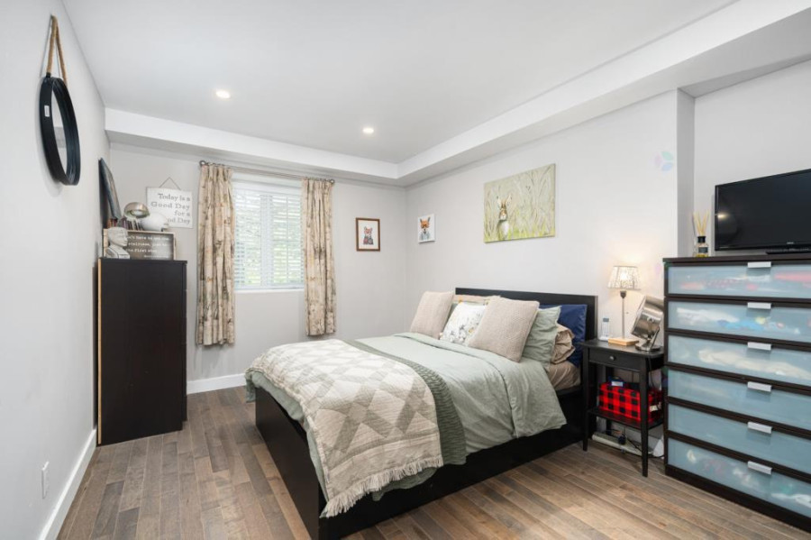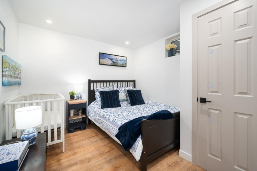二楼为四间卧房配置,其中主卧空间宽敞,设有步入式衣帽间与全新装修卫浴(含玻璃淋浴、双盆台面、现代柜体等)。其余三卧采光良好,空间方正,适合孩童、书房或客房使用。楼层另设家庭卫浴及阅读角,舒适实用,格调温馨。地下室空间灵活,2022-2024年分阶段翻新。设有大型多功能厅、第五卧房、全新卫浴(含地暖、暖毛巾架)与后院独立出入口,适合打造成影音室、办公空间或长者独立居住区。配套机房与储藏空间完善,双层隔热、地面抬升、结构更新俱全,整体安全稳固。