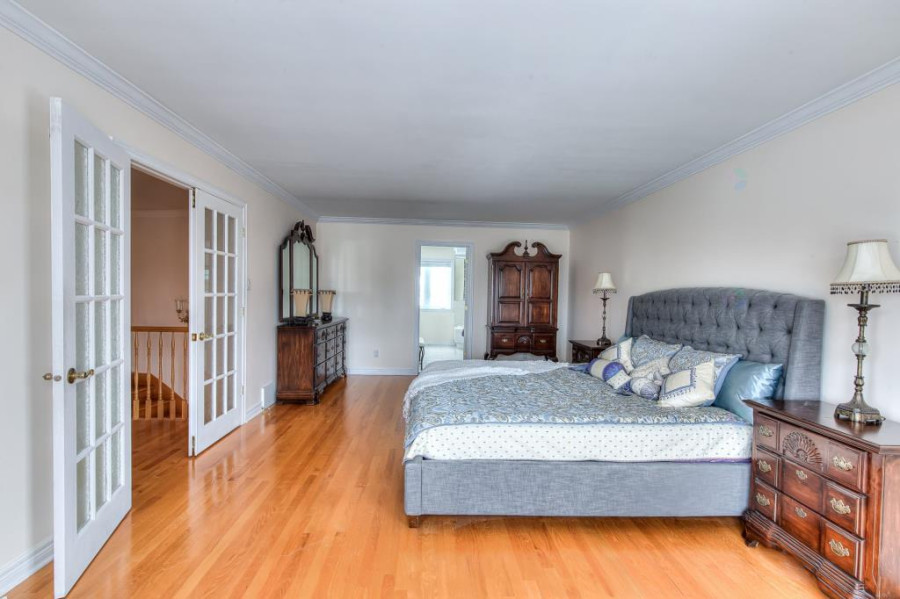 二楼为家庭私密生活空间,包含四间铺设实木地板的大卧室与两间完整浴室。主卧套房设有更衣室与新近翻新的套内卫浴(含独立淋浴与浴缸)。其他卧室空间方正、采光良好,适合孩童、书房或访客用途,配套浴室宽敞实用,满足大家庭多样需求。