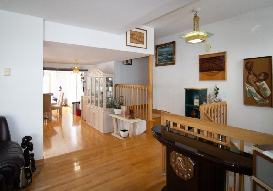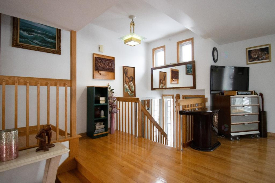主层采用经典三卧室布局,并配备宽敞客厅、独立餐厅与升级厨房。厨房以实木橱柜搭配大型中岛设计,空间利用极佳,并通往后方增建的明亮家庭厅,大面积窗户带来充足自然采光,日常生活与家庭聚会皆宜。原木地板贯穿整层空间,营造出温馨连贯的居家氛围。