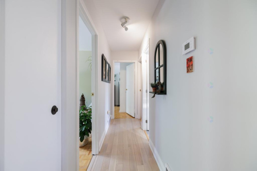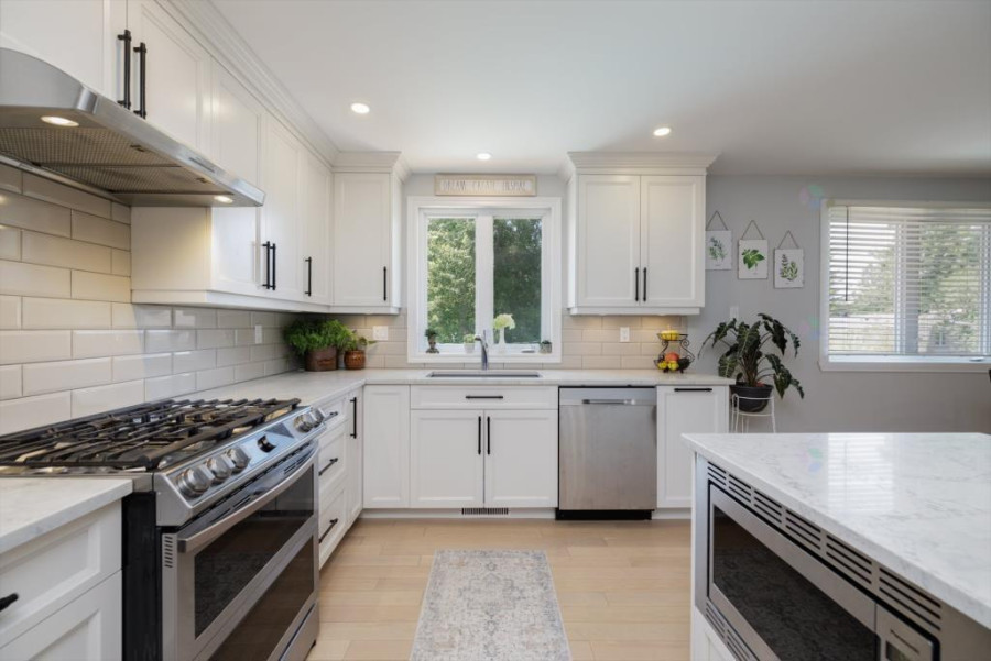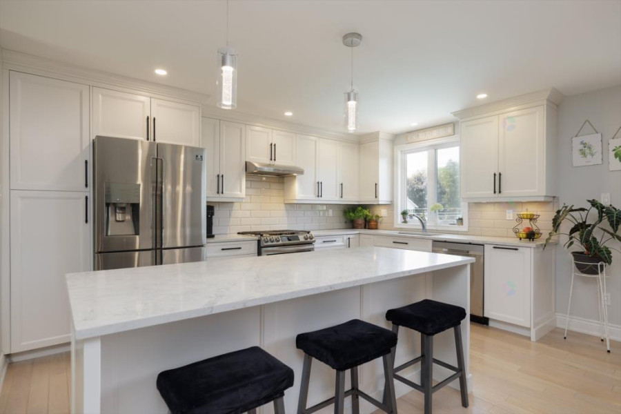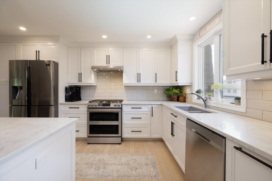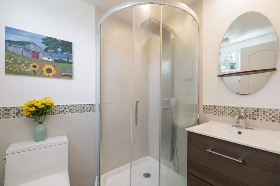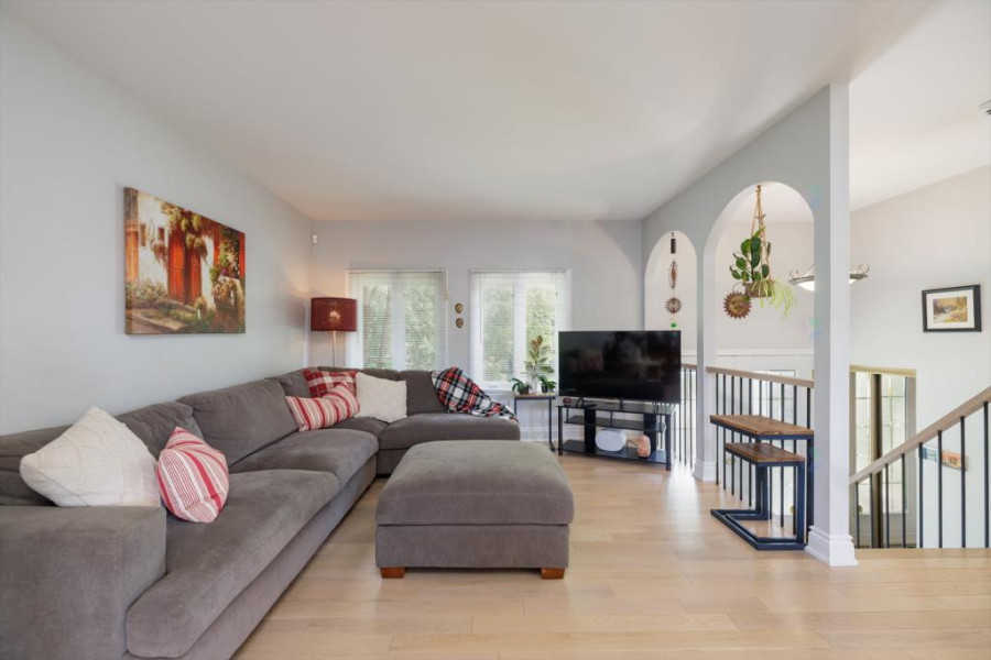 主层采用现代化设计,配备三间卧室、两间浴室及开放式厨房、餐厅与客厅区域。厨房为近期翻新,全白橱柜搭配大尺寸中岛,配有天然气炉具与不锈钢电器组,并以落地窗连通餐厅与后阳台,采光充足。客餐厅与走廊全铺实木地板,布局方正,居住舒适性佳。主卧带独立卫浴,空间宽敞,视野通透。地下室全面装修,设有大型家庭厅、书房(可灵活转换为卧室或工作室)、额外化妆间与多功能储物空间。家庭厅配置天然气壁炉,地面为人字形拼接实木地板,温馨典雅。洗衣区、机械房及大型储藏间一应俱全,实用性强。