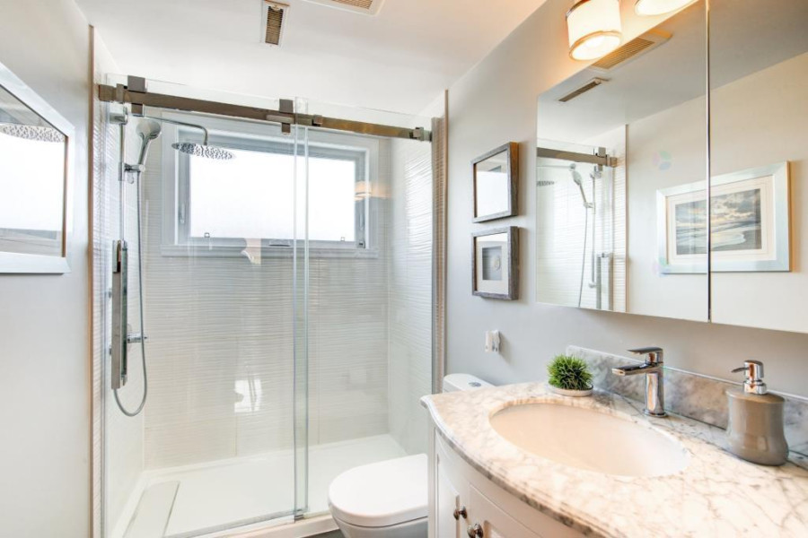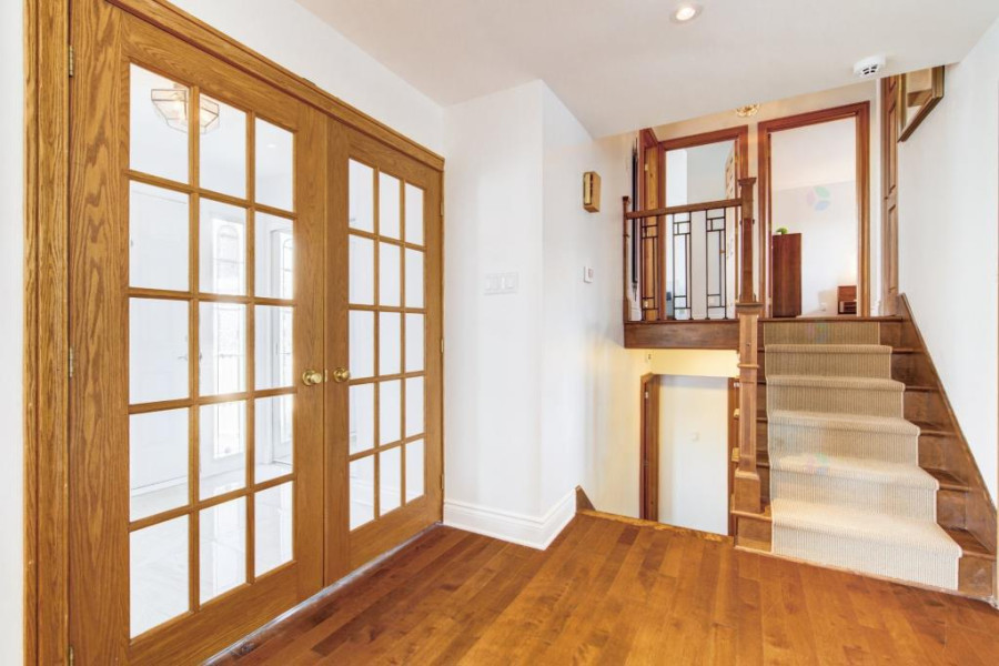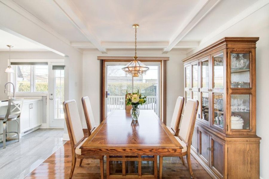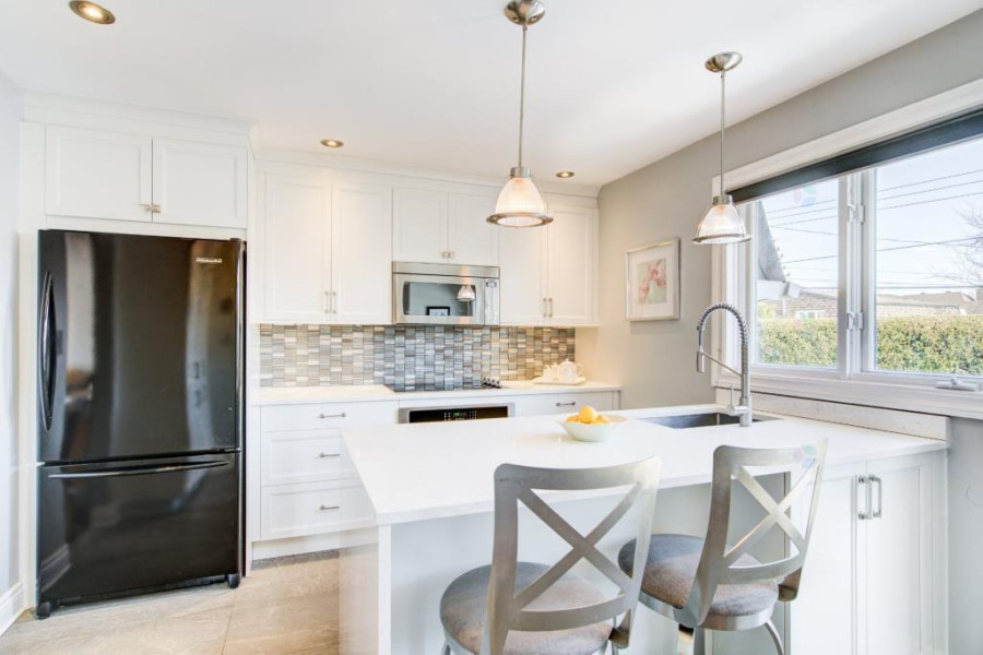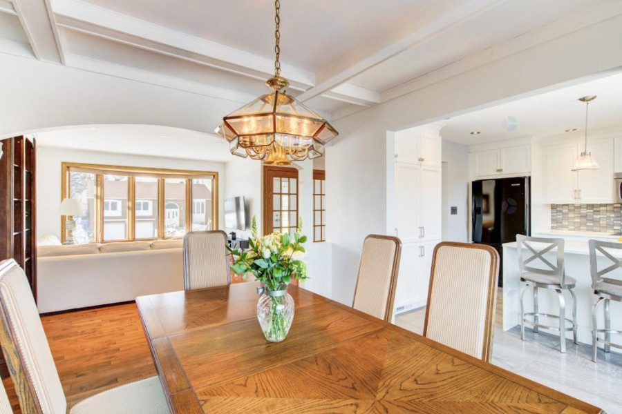 主层设有采光极佳的客厅,配备凸窗,视野开阔;餐厅通向庭院露台,适合家庭聚会与日常用餐。厨房由Vima Design于2018年专业翻新,配有石英台面中岛、瓷砖地面与马赛克背板,功能与美观兼具。