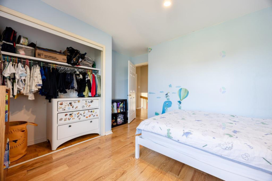 二楼卧室布局方正,主卧带步入式衣帽间与套内卫浴,私密与收纳兼备;其余卧室尺度适中、采光良好,可灵活作为儿童房或书房。楼层更迭木楼梯与更新木地板,整体观感统一而雅致。