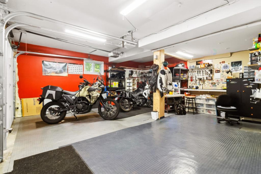 后院为全封闭私家庭院,绿化成熟,设有多层平台与加热泳池(2020年更换),并配有大型储物间,适合夏季聚会与休闲活动。双车库空间宽敞,另有四车位车道,实用性与便利性兼备。