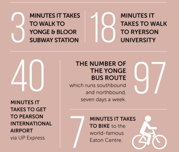 步行3–10分钟可抵达Bloor-Yonge、Sherbourne及Wellesley地铁站,附近商场(Holt Renfrew, Zara, H&M)与超市(Longos, Loblaws, Shoppers, No Frills等)一应俱全;