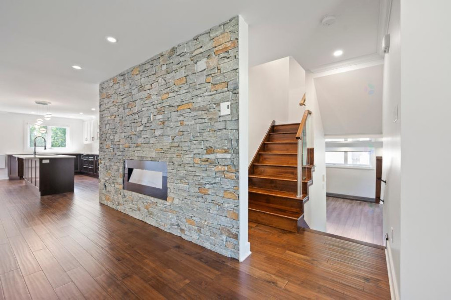 主层空间开阔,客厅采光极佳,配备壁炉与现代石墙装饰,餐厅与厨房连通,动线流畅。厨房于2020年全新打造,配置高端橱柜、石英台面、内嵌式家电及酒柜,风格简洁大方,功能齐全,适合家庭日常与待客聚会。
