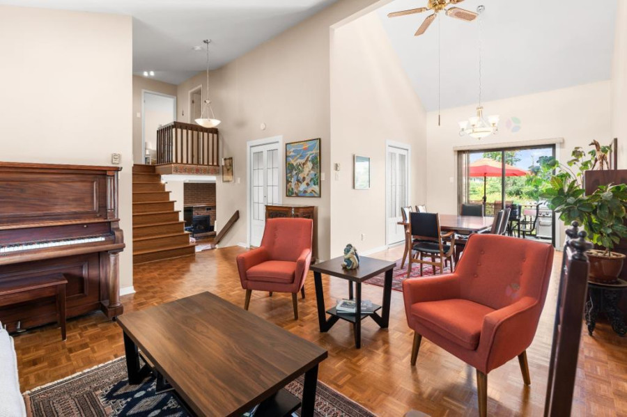 主层布局方正,客厅与餐厅采用开放式设计,挑高天花,空间感极佳,并可直接通向高架木质平台,俯瞰后院景观。厨房面积宽敞,配备早餐角,适合家庭日常餐饮与休闲。二楼设主卧套房,带独立卫浴,另有两间次卧与一间完整浴室,空间充足,采光通透,满足家庭需求。