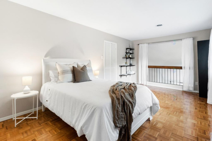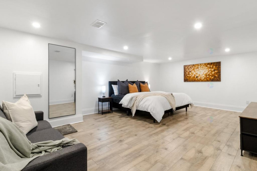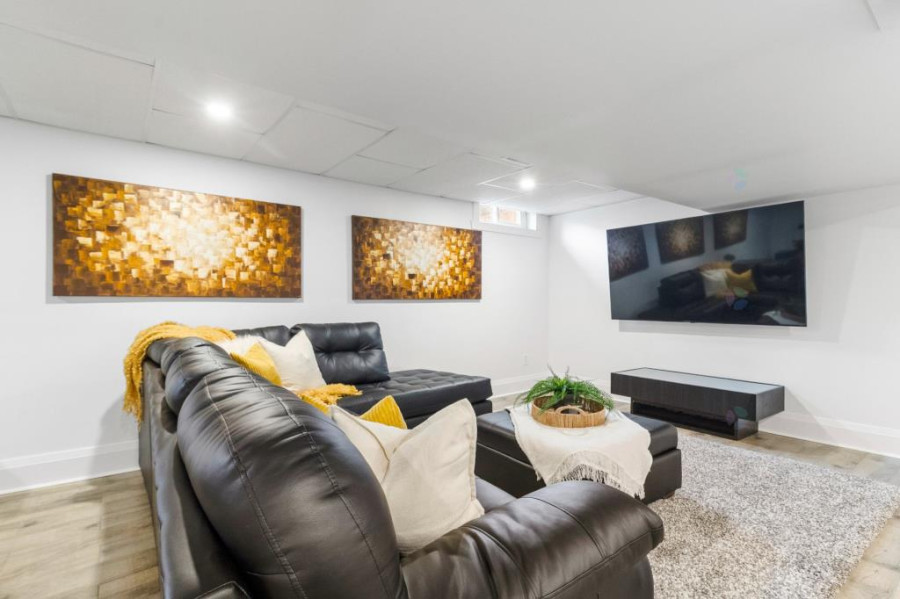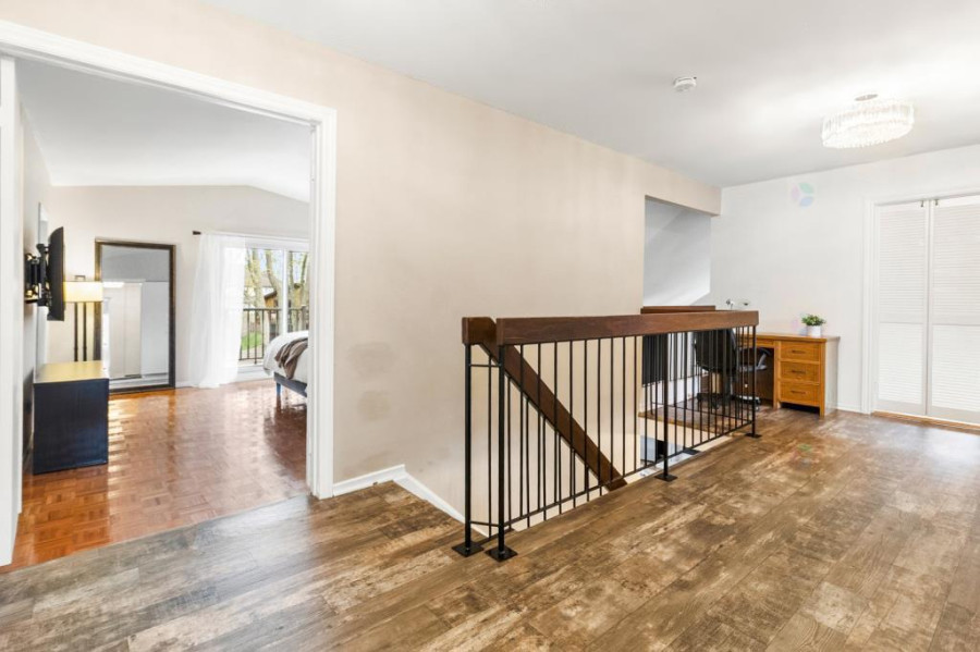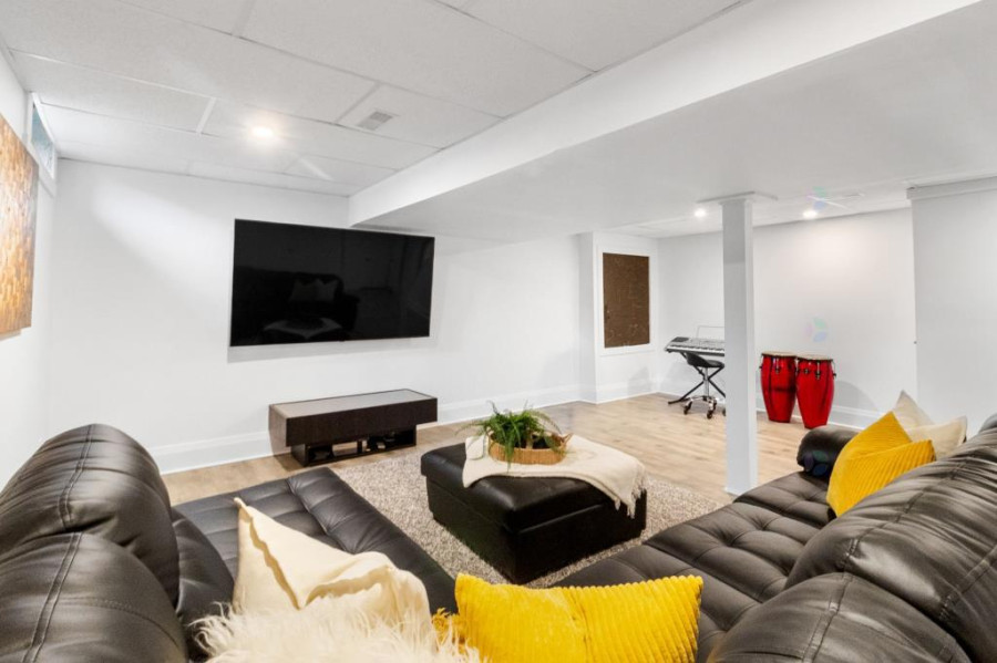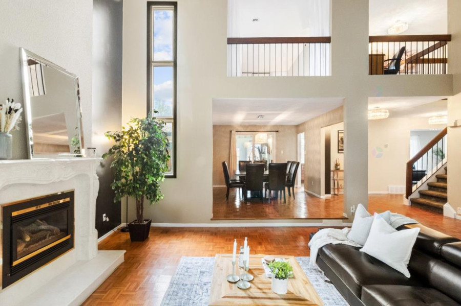 主层设有客厅、餐厅与家庭厅,均配备壁炉,空间温馨舒适。厨房面积宽敞,装饰以现代木纹橱柜及石材操作台,连接明亮的多功能日光室。全屋铺设实木或瓷砖地面,整体氛围典雅现代。二楼主卧空间开阔,配有步入式衣帽间、独立卫浴及专属阳台。其他卧室采光良好,布局实用,适合作为儿童房或书房。公共浴室亦经过翻新,设施齐备。地下室为全装修成品空间,设有家庭活动室、第五卧室、储物间及机房,功能丰富,满足多样需求。