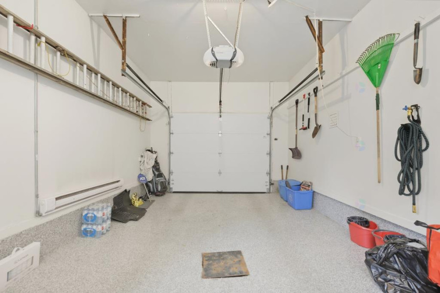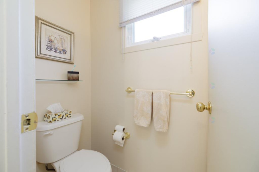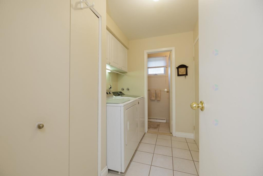 主层采用典型的 cross-hall 格局,玄关铺设陶瓷地砖,正对客厅与餐厅。客厅采光充足,空间方正,与餐厅区域相对分区,适合正式宴客或家庭活动使用。家庭厅设有木质壁炉,并通过玻璃门直通后院露台,是日常生活与休闲娱乐的核心空间。厨房面积宽敞,设有独立用餐区,大窗引入充足自然光,整体明亮舒适。主层还设有洗衣房与化妆间,生活动线合理。