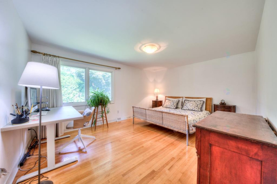 三层配置三间卧室及一间全卫;主卧空间宽裕,窗景良好,其余两间卧室均具备实用收纳。地面为硬木铺设,卫浴空间保持整洁。入口层另设一间卧室与一间卫浴,可灵活用于长辈房、书房或访客区,适合多代同堂或居家办公需求。房屋配备强制送风供暖与中央热泵系统,兼具能效与舒适度。外部设有四车位车道与内置单车库,出行便利。露台朝向后院,地块平整开阔,周围成熟植被围绕,私密性佳,非常适合家庭户外活动与休闲。