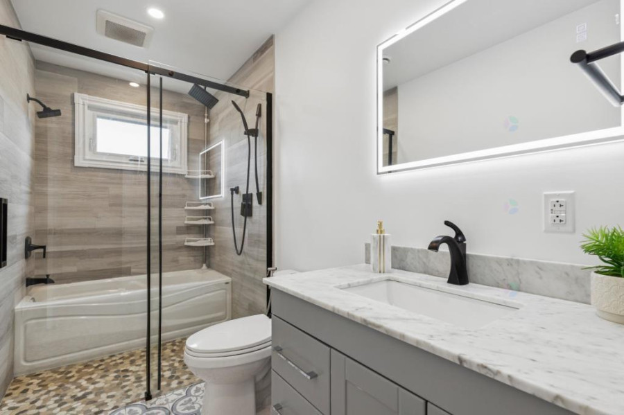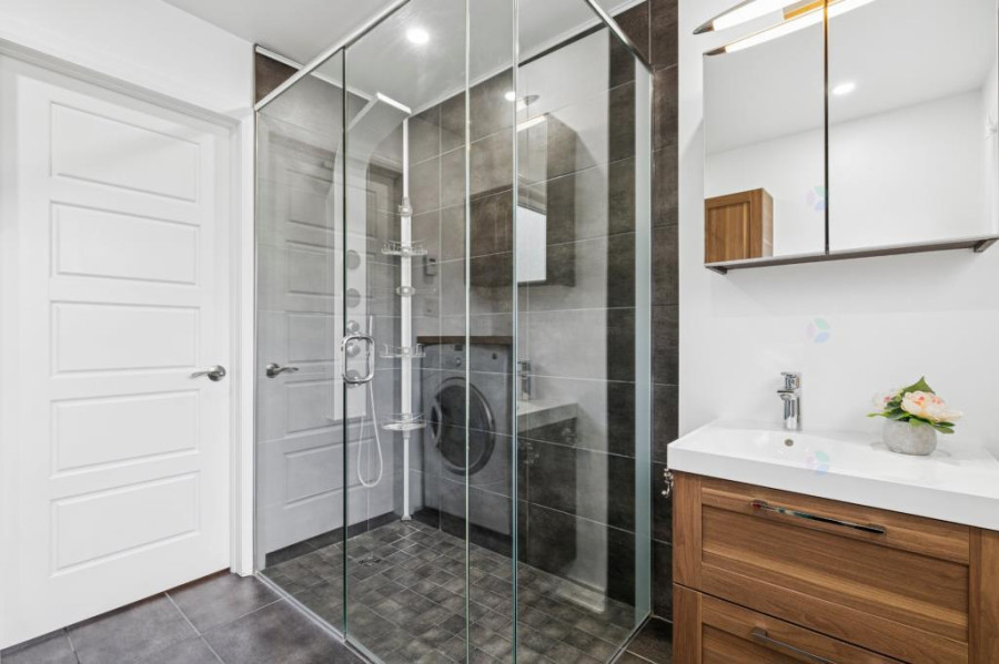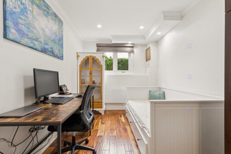 二楼配置三间卧室与一间翻新卫浴,空间方正,收纳到位;卫浴以玻璃淋浴与现代化洁具为核心,明亮利落,便于家庭高峰时段使用。下层为全尺寸完成空间,2022年更新,设大型家庭活动区与实用储物;花园层另设一间卧室与一间卫浴,适合长辈居住、客房或居家办公。独立洗衣房布局顺手。配套方面,采用电暖踢脚板供暖,壁挂空调与空气交换系统提升四季舒适度;设燃气壁炉增添冬日氛围。内置加热车库四季出入从容,另有车道可停放四车;并配电动车充电装置。