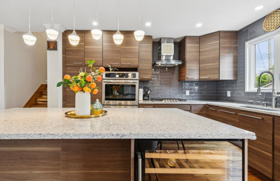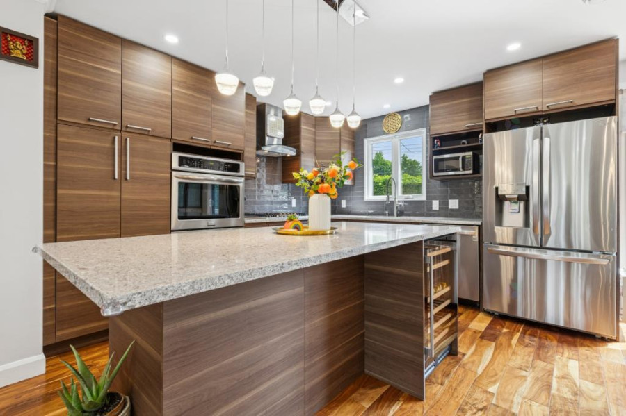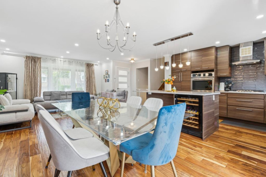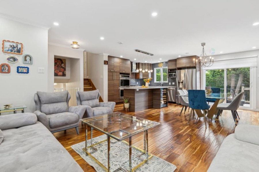 主层动线明晰,客厅—餐厅—厨房相互连通,采光通透。厨房全面翻新,配花岗岩台面、中央岛台与优质电器组合(含燃气灶、嵌入式双烤箱、微波炉与冰箱),烹饪与收纳功能兼备;硬木地面温暖耐用,待客与日常起居体验俱佳。