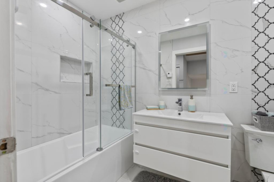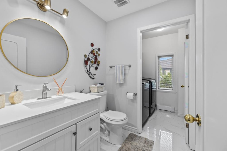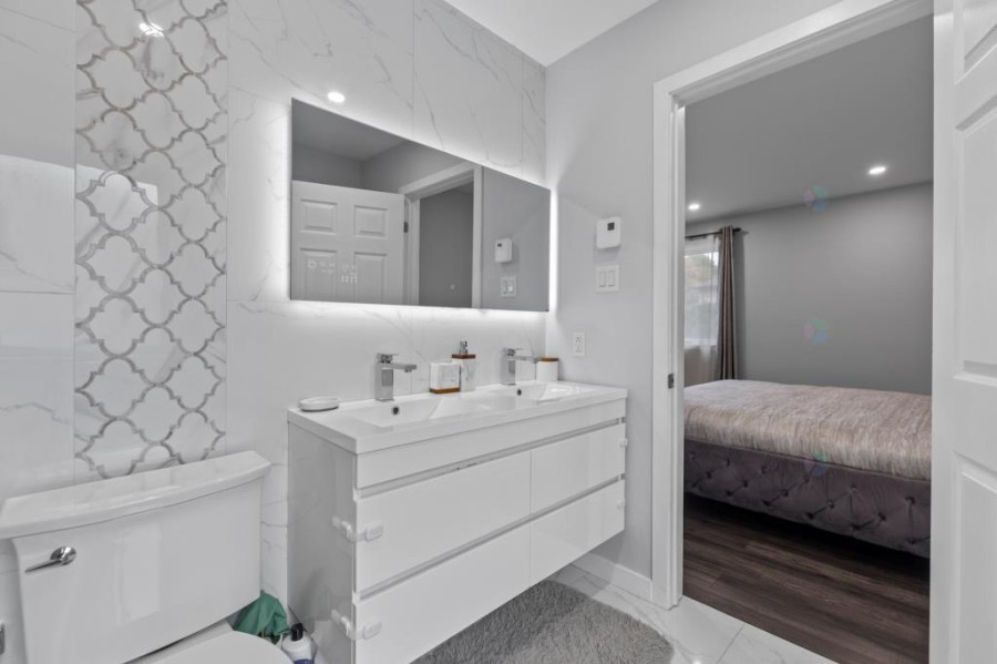 二楼设有三间卧室,其中主卧配有步入式衣帽间与全翻新的套内卫浴,装修简洁现代。其余两间卧室面积方正,共用另一间全新家庭浴室,整体空间布局合理,功能分区明确,适合家庭成员独立使用。地下层已全面装修,设有大型娱乐区、办公室/第四卧室及完整浴室,灵活适应不同家庭需求,可作为影音室、游戏区或访客套房使用。车库为1.5倍宽设计,提供额外储物空间,出入便利。