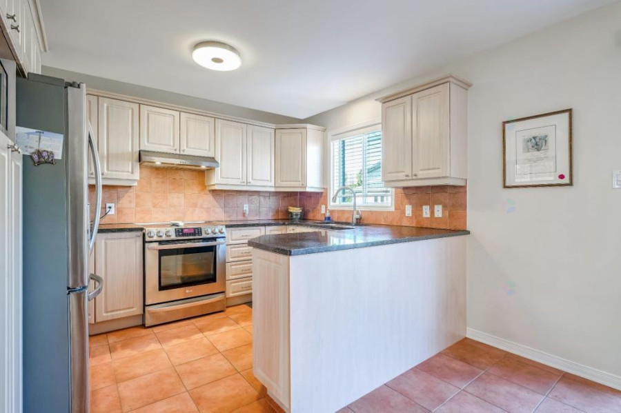主层设有通透的客餐厅,客厅铺设实木拼花地板,大窗引入充足自然光;餐厅与厨房相连,并配有通向后院露台的玻璃推拉门,方便户外用餐与活动。厨房布局合理,操作台面充裕,储物空间完善,适合家庭日常使用。主层还配有独立洗衣间与盥洗室,生活动线顺畅。