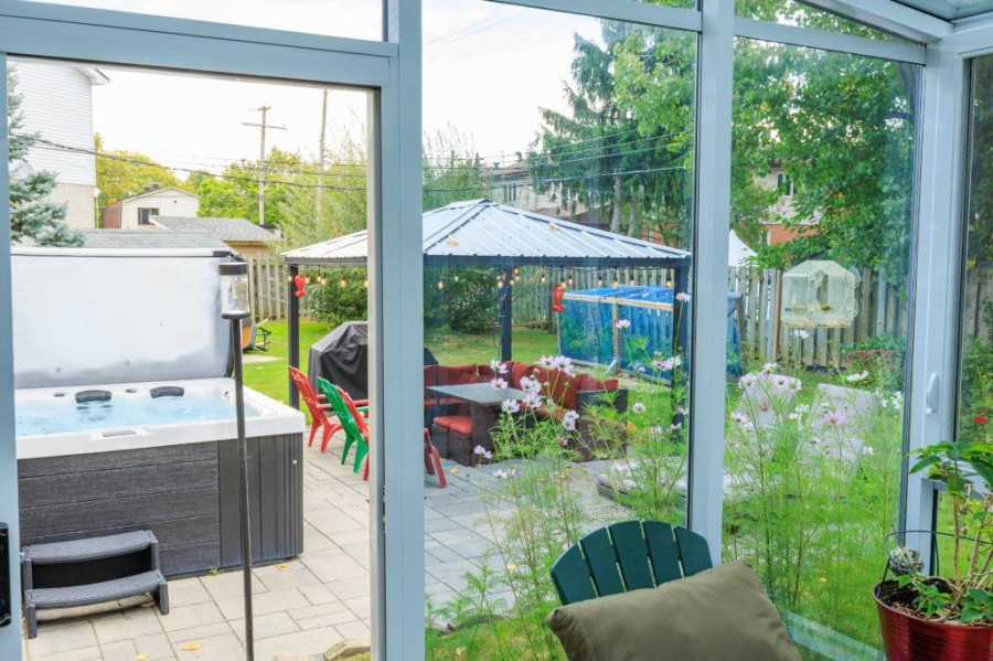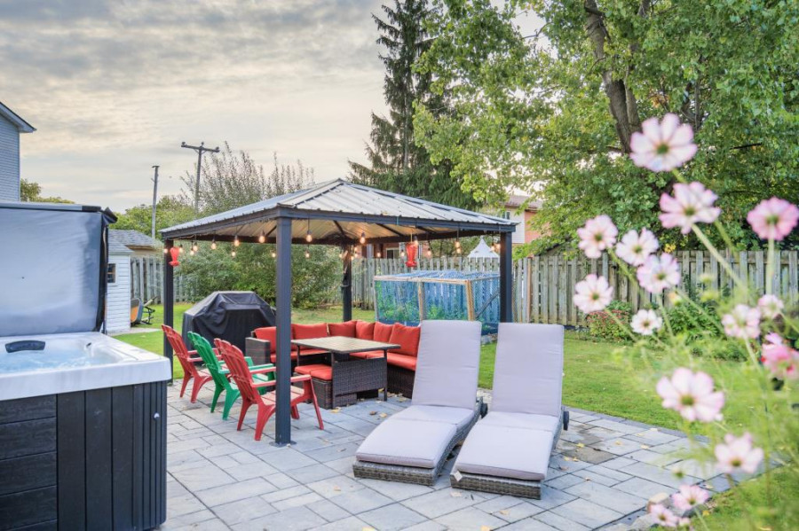 后院经过精心铺设 Pave-Uni 石砖,并增设日光室、SPA 以及凉亭,围栏与绿化形成私密庭院,非常适合户外聚会、休闲与亲子活动。庭院宽阔,环境舒适,兼具实用与景观效果。