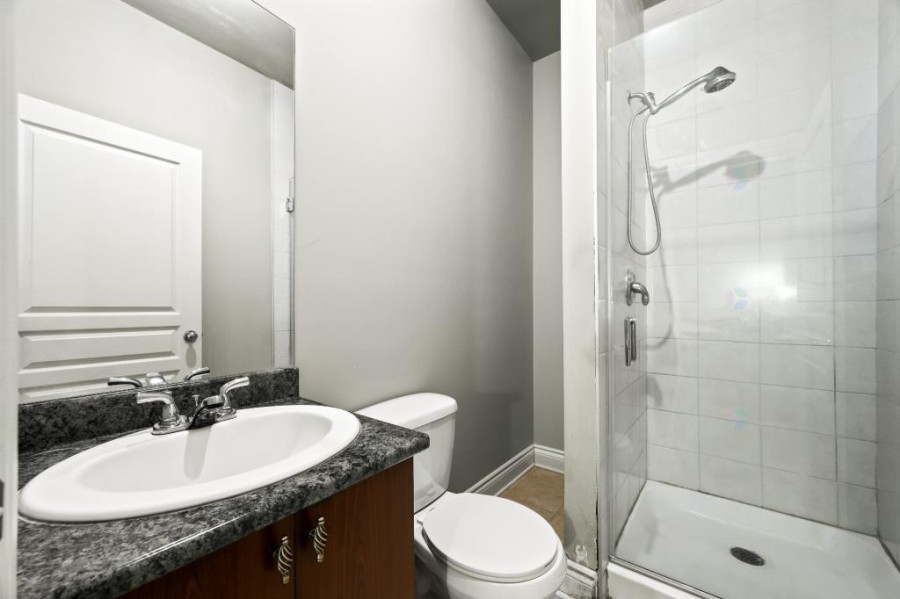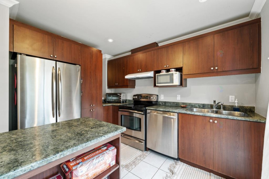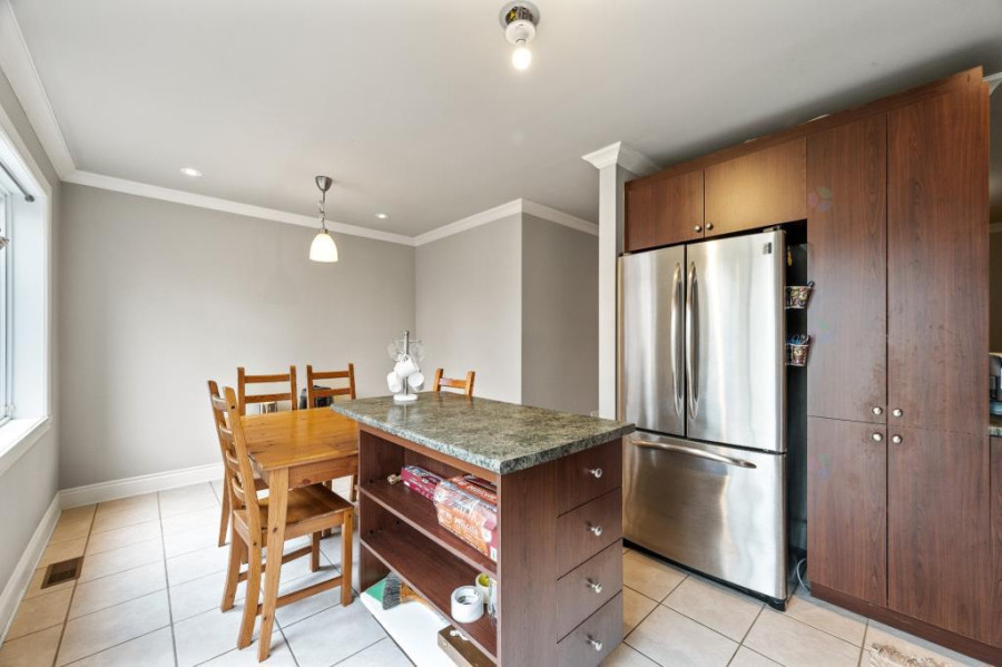 主层以开放式格局为主,玄关设有双门衣柜,宽敞客厅铺设木地板,配备燃气壁炉,空间温馨舒适;餐厅与厨房紧密相连,厨房空间充裕,配有中央岛台及早餐区,并可直通后院露台,适合家庭用餐及宴客。主层同时设有一间配玻璃淋浴的全卫浴,布局实用
