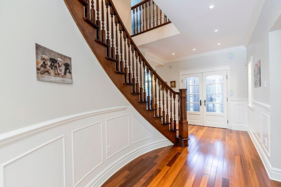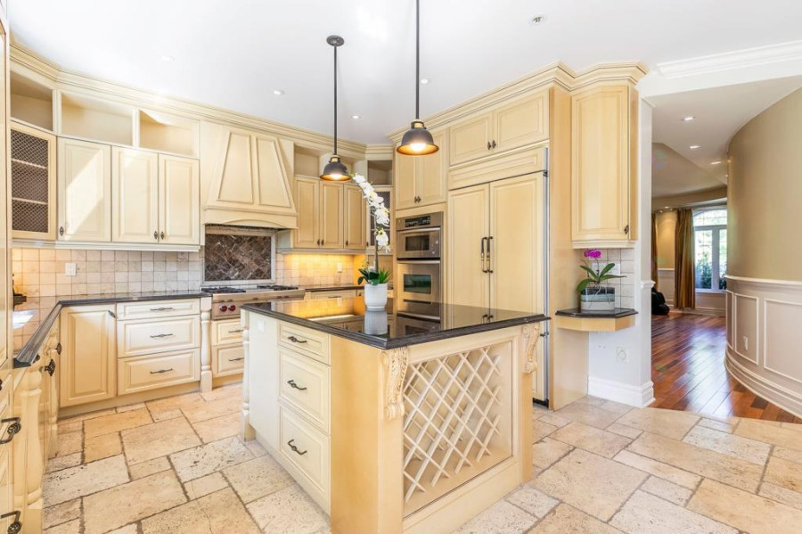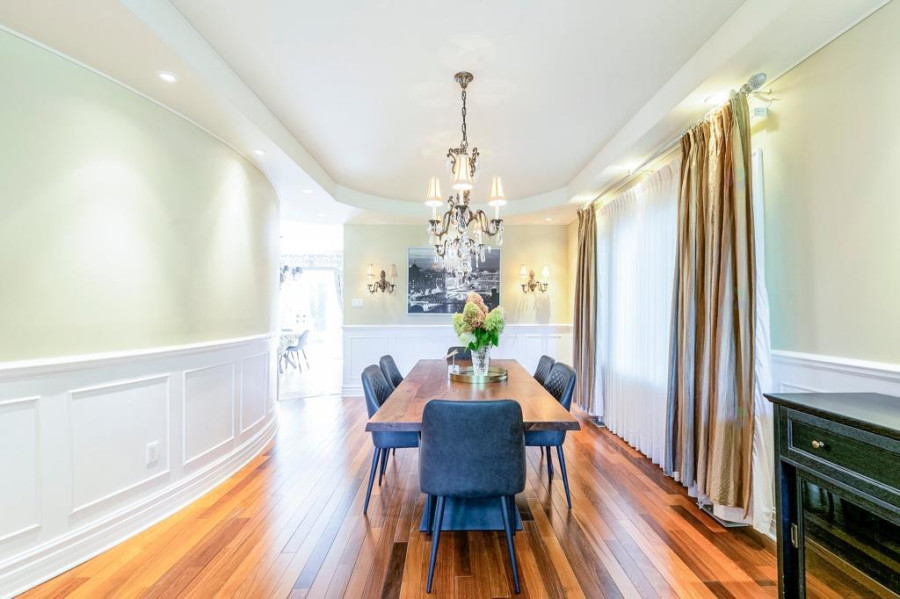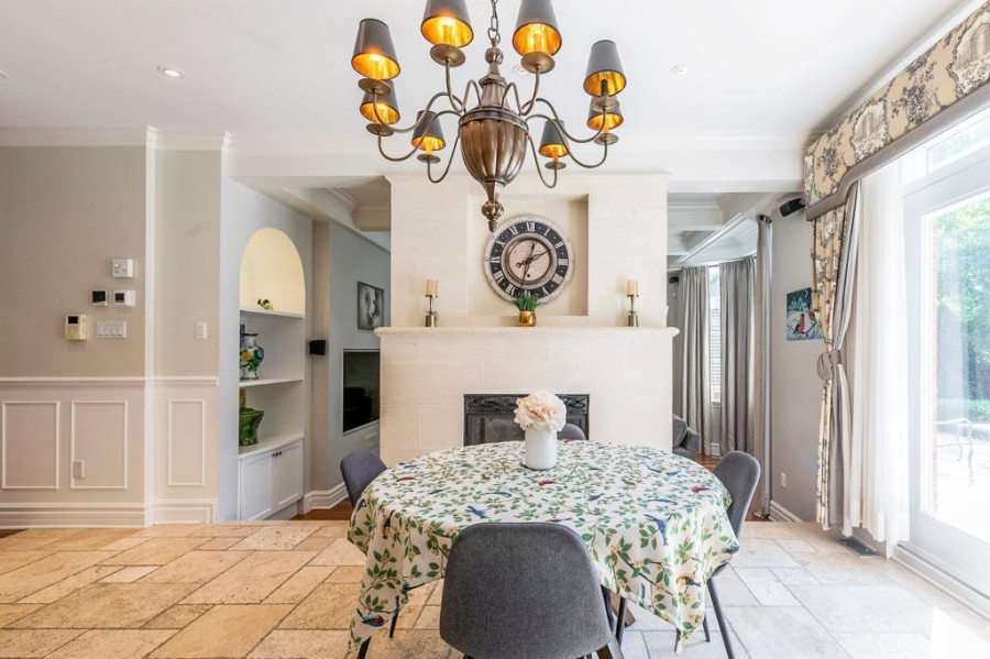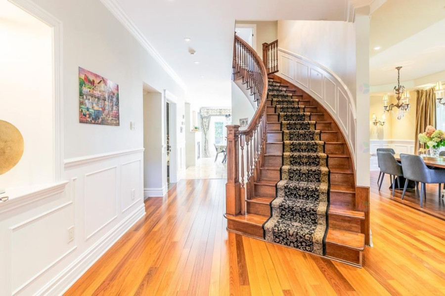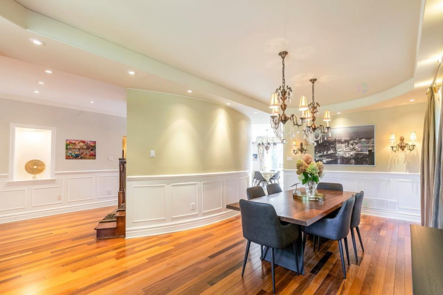 主层与地下室层高均为10呎,二楼为9呎。客厅与餐厅铺设巴西Ipe木地板,墙面有精致护墙板与线条装饰,所有窗户配备California百叶窗,整体空间明亮典雅。厨房采用花岗岩台面与大理石地砖,设有大型中岛,布局开放通透;厨房与客厅之间以双面燃气壁炉相隔,增添空间层次感与温馨氛围。主层另设宽敞玄关、洗衣房(带洗衣槽及楼上通道)与大型盥洗室,细节设计考究。