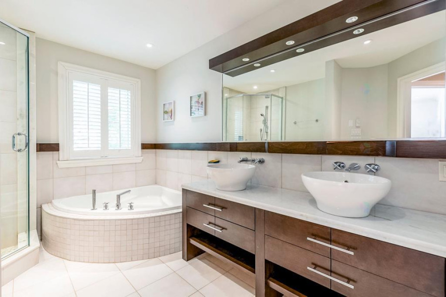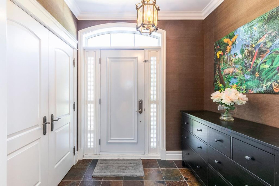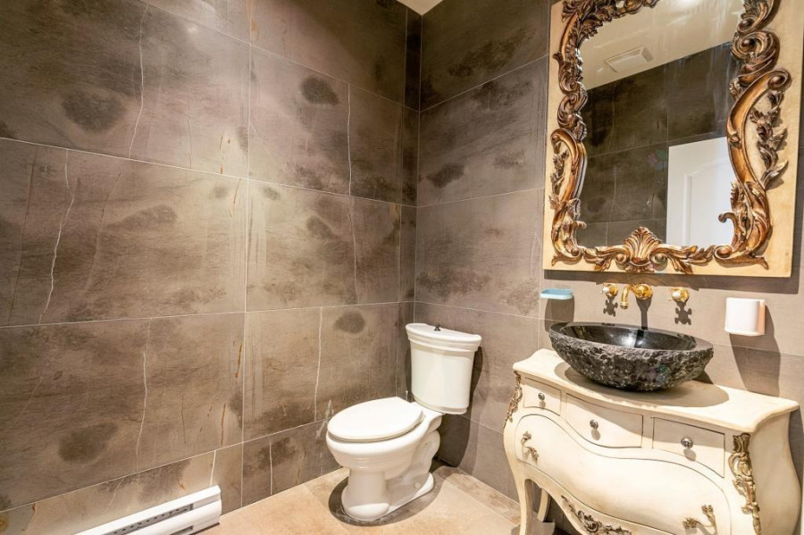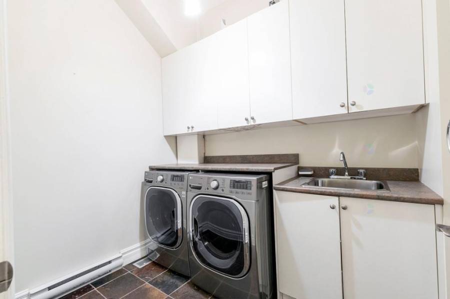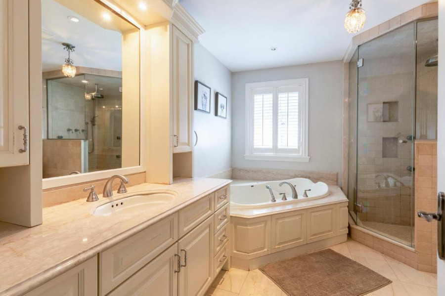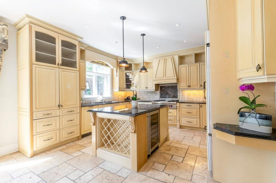 主层与地下室层高均为10呎,二楼为9呎。客厅与餐厅铺设巴西Ipe木地板,墙面有精致护墙板与线条装饰,所有窗户配备California百叶窗,整体空间明亮典雅。厨房采用花岗岩台面与大理石地砖,设有大型中岛,布局开放通透;厨房与客厅之间以双面燃气壁炉相隔,增添空间层次感与温馨氛围。主层另设宽敞玄关、洗衣房(带洗衣槽及楼上通道)与大型盥洗室,细节设计考究。