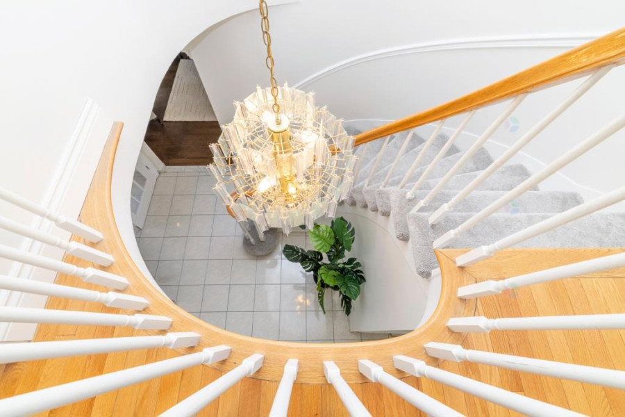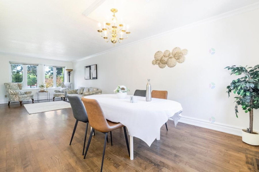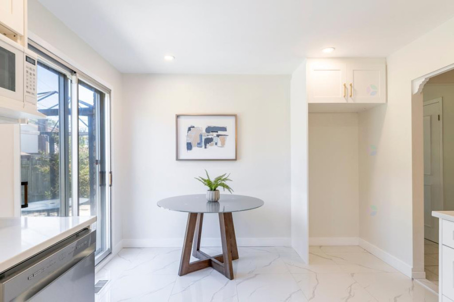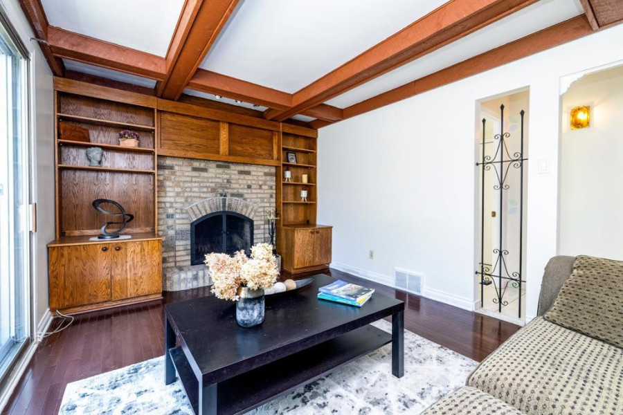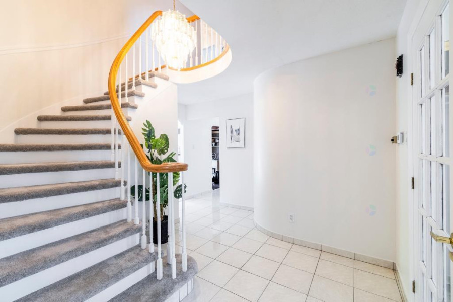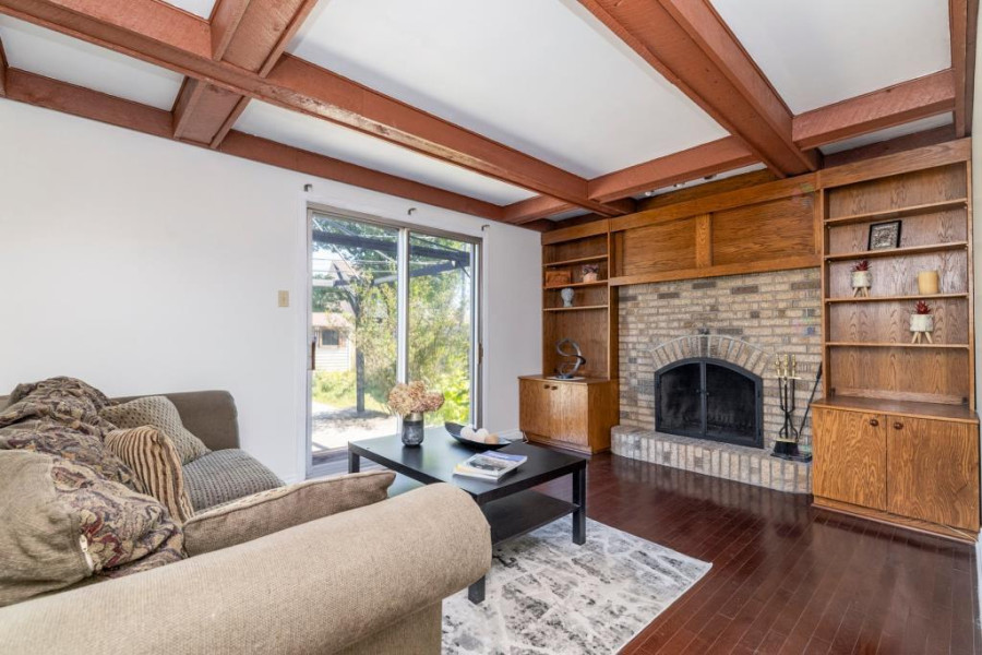 主层格局分明,客厅与餐厅相连,铺设木地板,采光充足。厨房于近期翻新,设计现代实用,配有充裕的橱柜空间与开放式早餐区,并通过滑门通向后院露台。毗邻的家庭厅保留原木天花横梁与砖砌壁炉,空间温馨舒适,非常适合家庭休憩与聚会。主层另设洗衣房与盥洗室,生活动线便利。