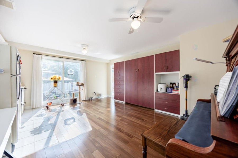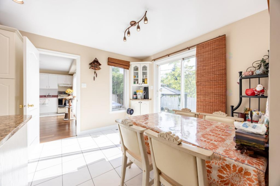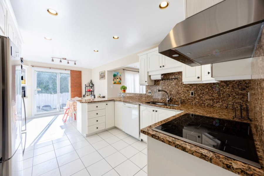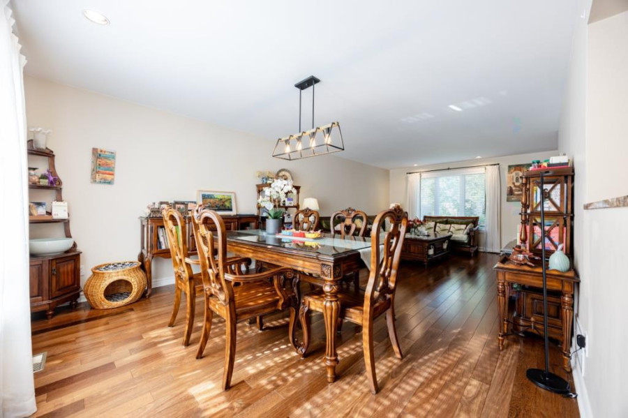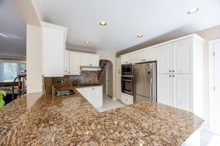 主层设有明亮宽敞的客厅与正式餐厅,厨房经过更新,配置花岗岩台面、充足柜体与早餐角落,兼顾实用与风格。客厅与厨房之间空间流通,适合家庭日常使用及亲友聚会。主层另配一间独立办公室或卧室,并设有洗衣间及洗手间,布局贴近现代生活需求。