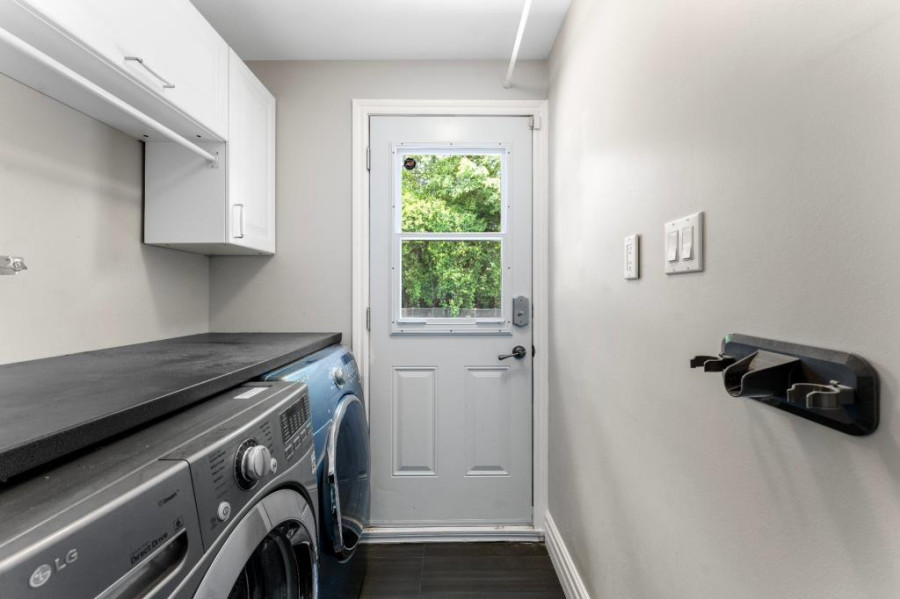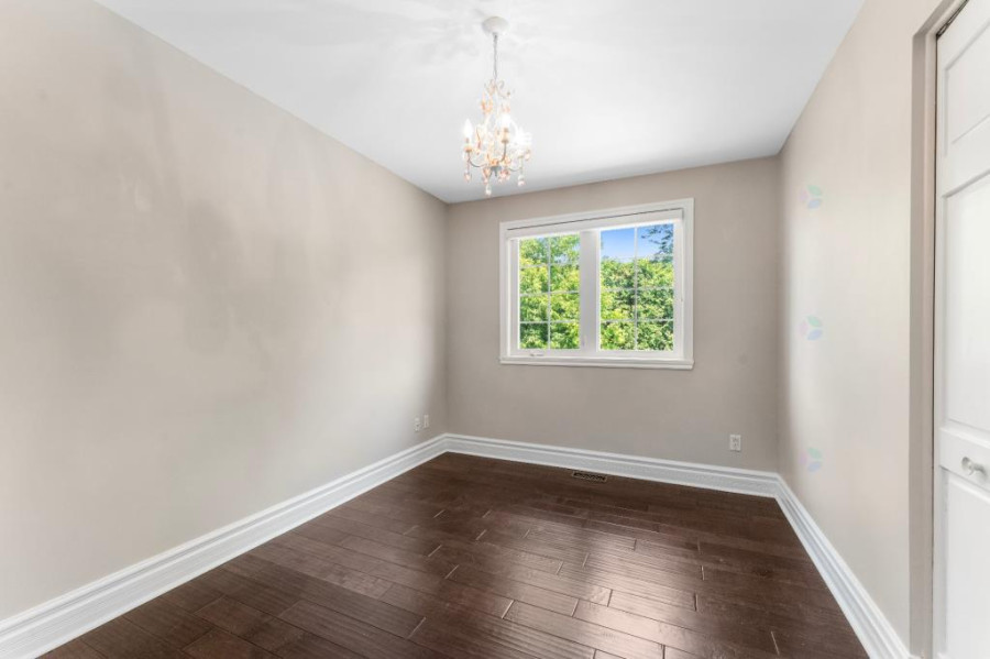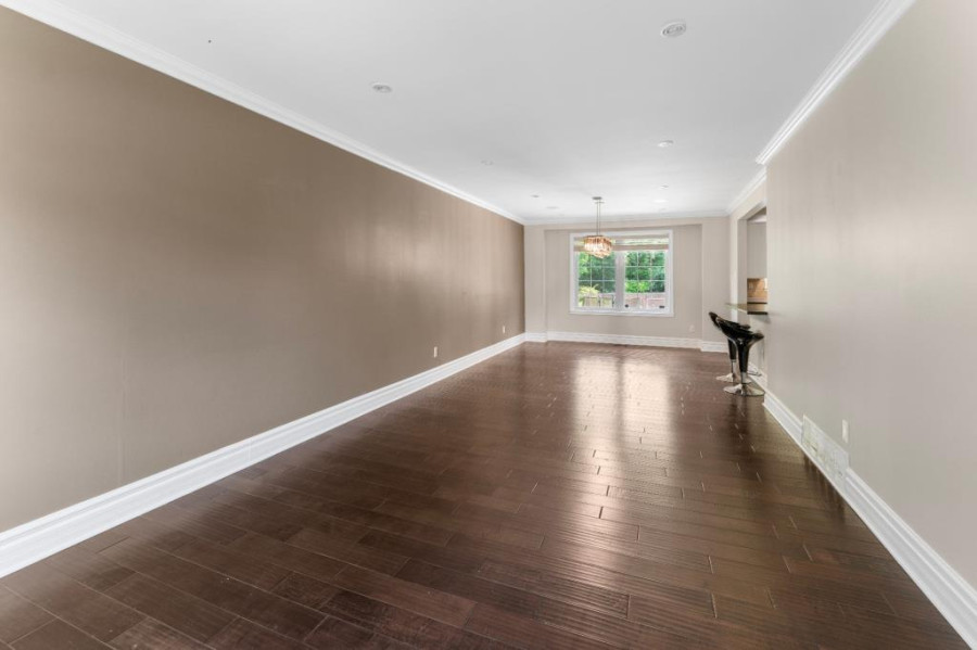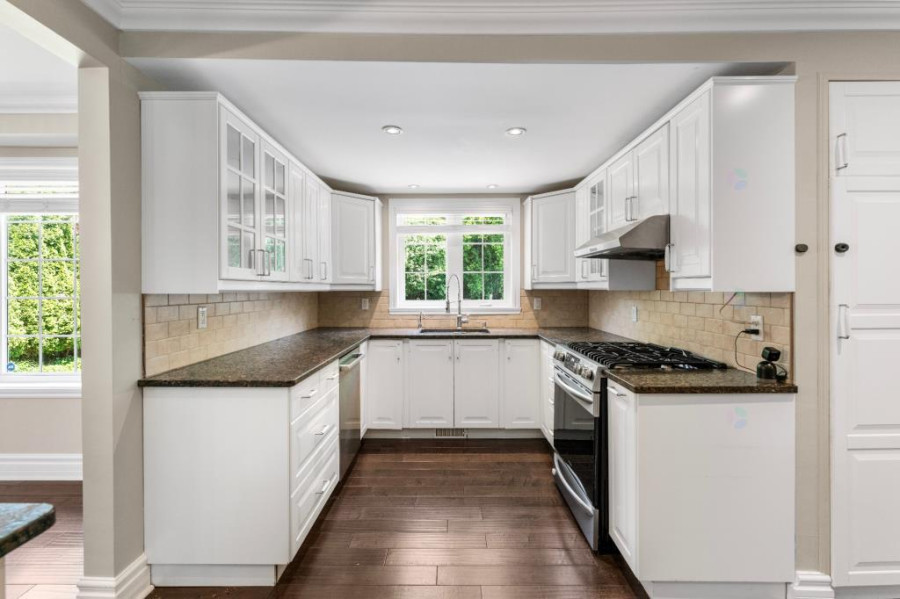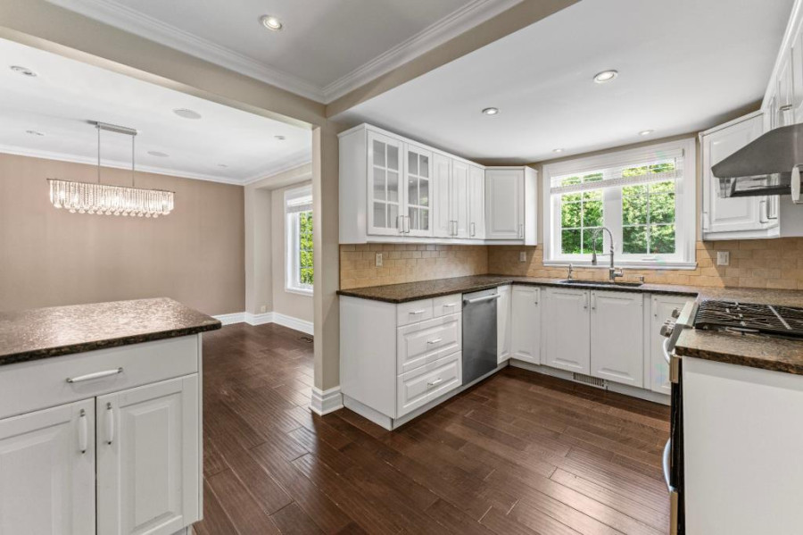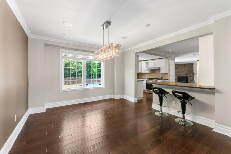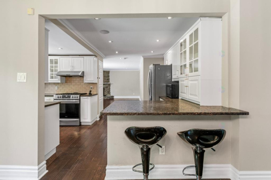 主层采用开放式格局,采光充足,设有宽敞的客厅与餐厅,并延伸至带有石质壁炉的家庭厅,法式滑门通向后院花园,空间流畅大方。厨房配备燃气灶具与实用橱柜,连接独立洗衣间与盥洗室,满足日常家庭生活的多样功能。整体主层空间舒适温馨,非常适合家庭聚会与日常起居。