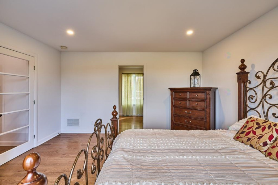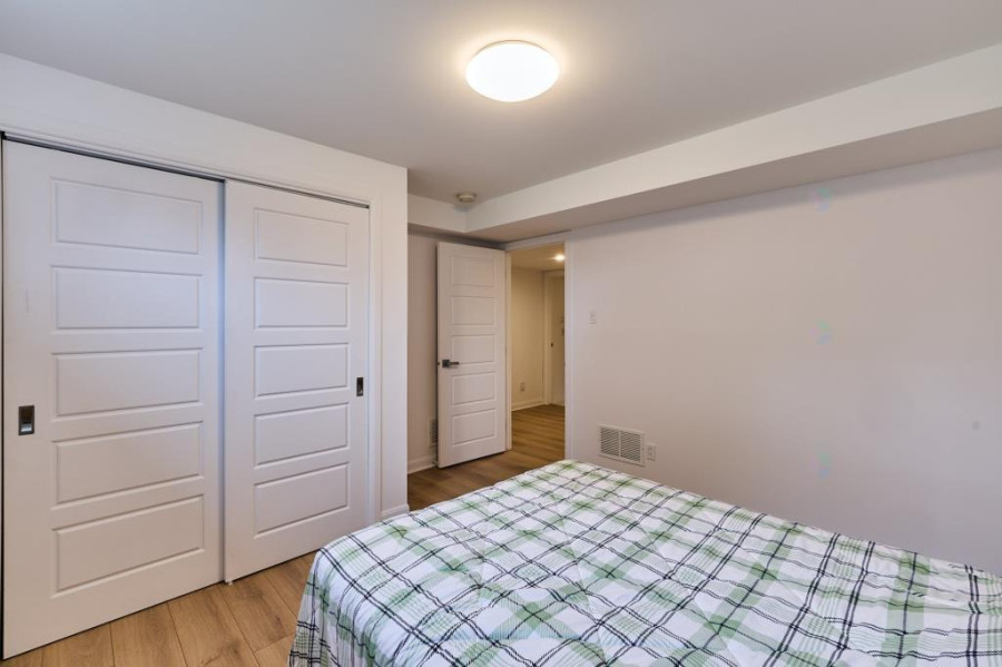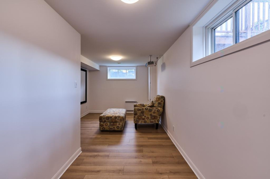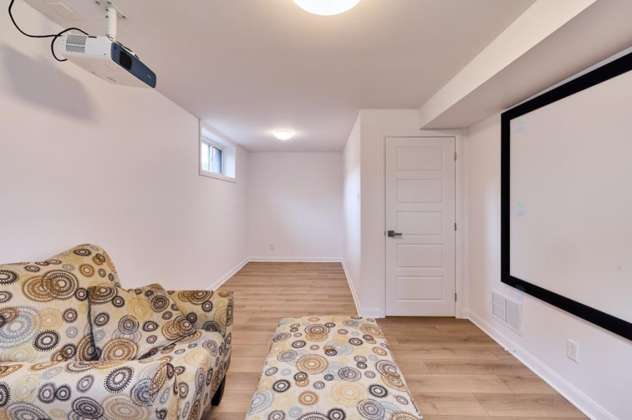 二楼设四间卧室与两间全卫,主卧面积宽敞,配有步入式衣帽间,私密性良好;其余卧室方正实用,均铺木地板,采光良好,可灵活作儿童房、书房或客房使用。浴室采用独立淋浴与浴缸分区设计,细节考究,兼顾舒适与品质。地下室为全装修空间,设家庭娱乐区、一卧一卫,可作家庭影院或多功能房。地板铺设复合木材,层高良好,空间利用率高。