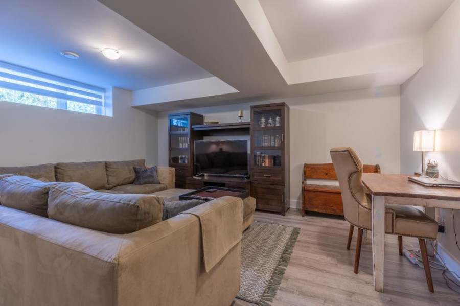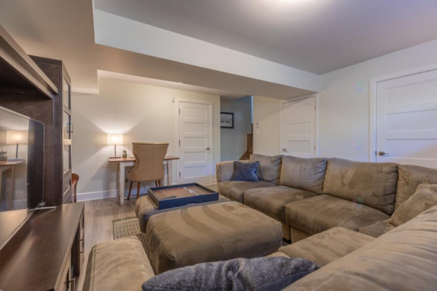 二楼设三间卧室与两间全卫,主卧带步入式衣帽间及套间浴室,设计宽敞舒适。其余两间卧室方正实用,采光良好,适合作为儿童房或书房使用。地下层为全装修空间,设家庭娱乐区与独立卫浴,适合多用途使用。外部空间包含私密露台与宽敞庭院,配有燃气烧烤接口及围栏绿化,适合户外休闲与聚会。车库为并排双车位 + 额外车道一位,共可停三车,地下车库配电动门与储物空间,出入便捷。