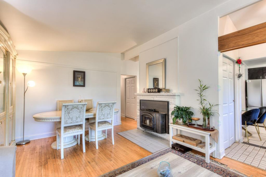 主层设开放式客餐空间,客厅铺设实木地板并配备壁炉,采光通透、氛围温馨。厨房设计紧凑,配备现代电器与早餐角,动线顺畅;主层另有三间卧室与一间完整浴室,适合家庭日常居住。整体空间保养良好,色调明亮,格局实用。
