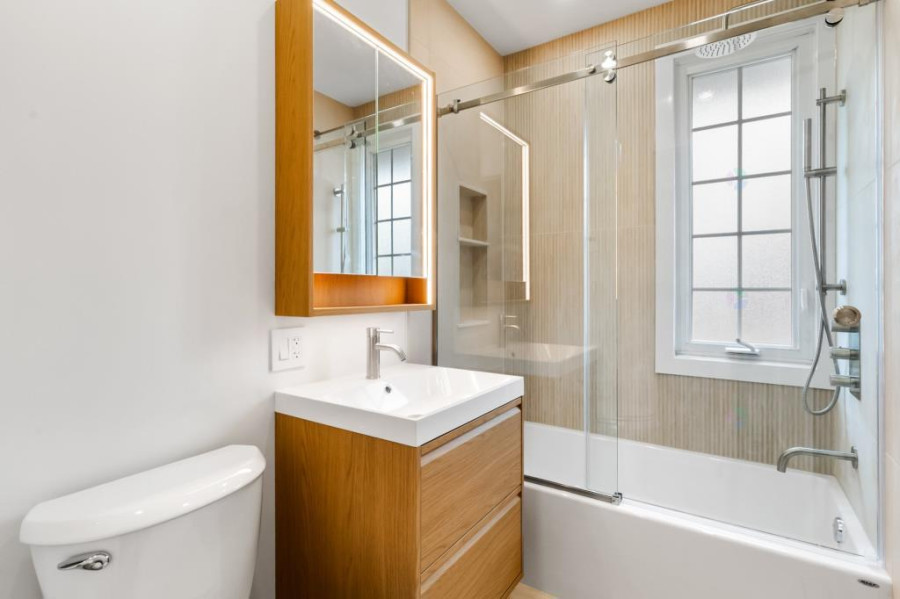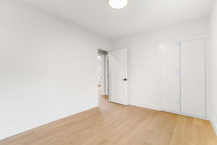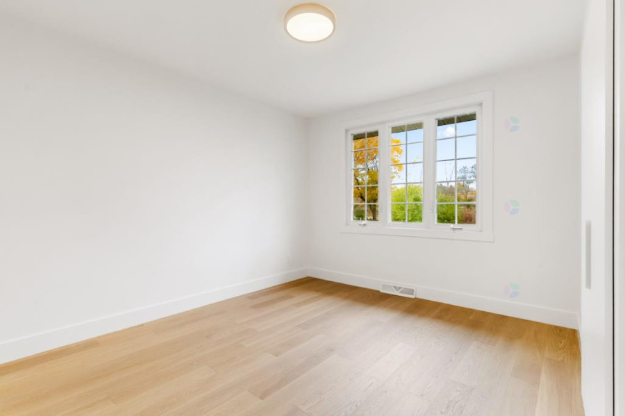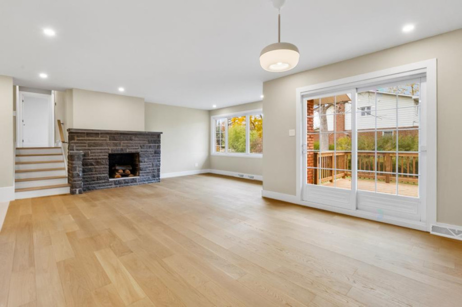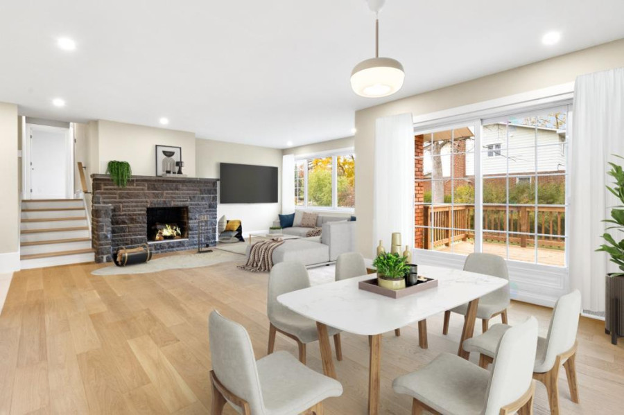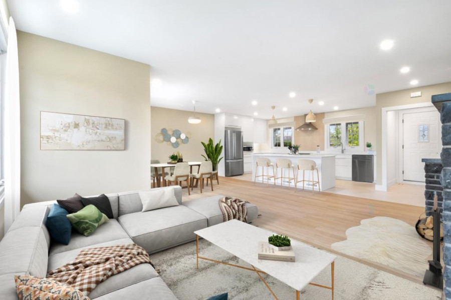 主层采用开放式设计,客厅与餐厅贯通,铺设全新实木地板,空间开阔明亮。厨房全面翻新,配备地暖系统,设计现代实用,与用餐区域自然过渡,为家庭聚餐与日常娱乐提供理想场所。隐藏式结构梁的设计更增添空间美感,整体布局流畅合理。