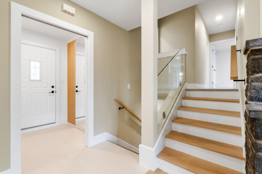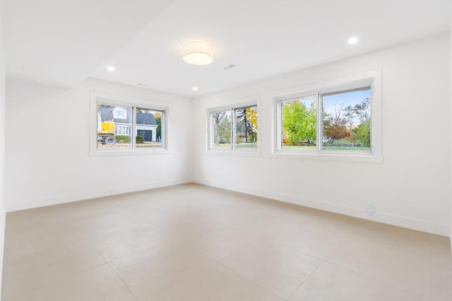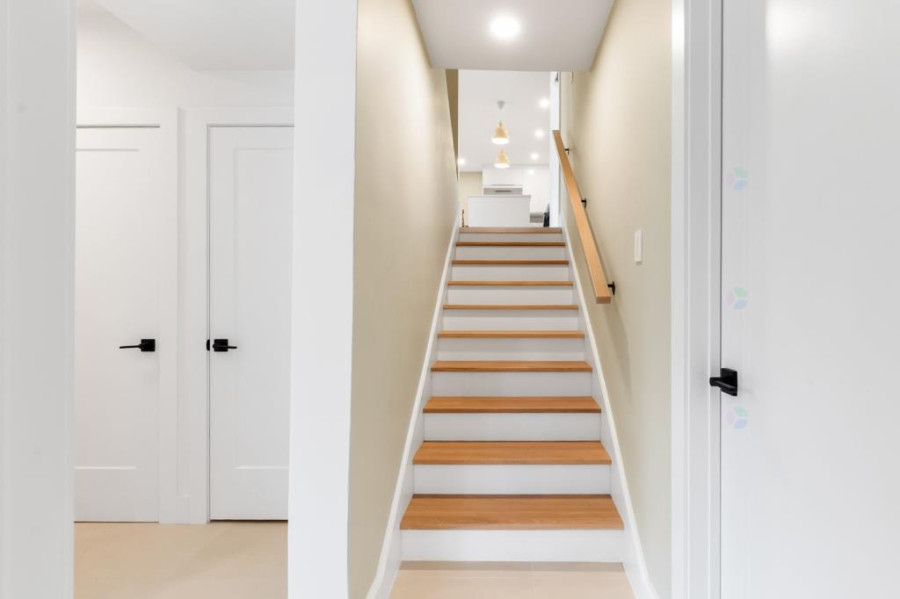 上层为私密休息区,包含三间卧室,均铺设实木地板,并配有定制内置衣柜,收纳功能完备。主卧宽敞舒适,采光良好。此层设有两间全套卫浴,均配备地暖系统,设计现代,设施全新,提供舒适便捷的生活体验。下层空间功能丰富,设有一间额外卧室、宽敞家庭活动室及实用洗衣房,全部铺设瓷砖,耐用易清洁。此外还设有一间化妆间,方便客人使用。直接通往车库,出入便捷,满足家庭储物与停车需求。
