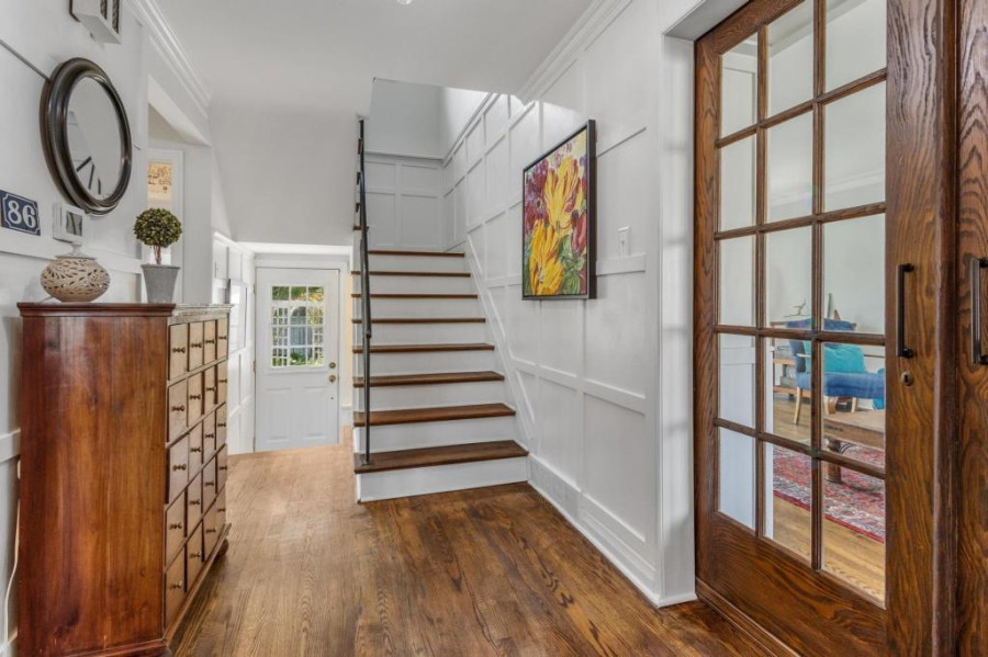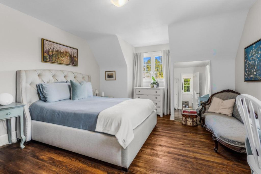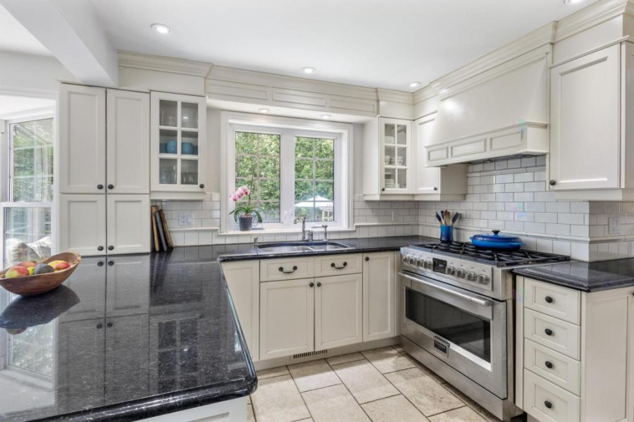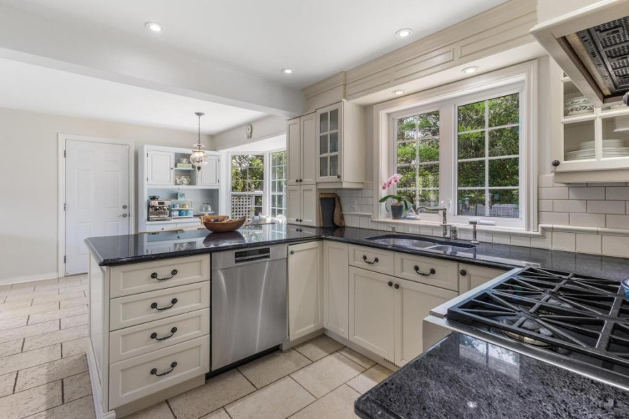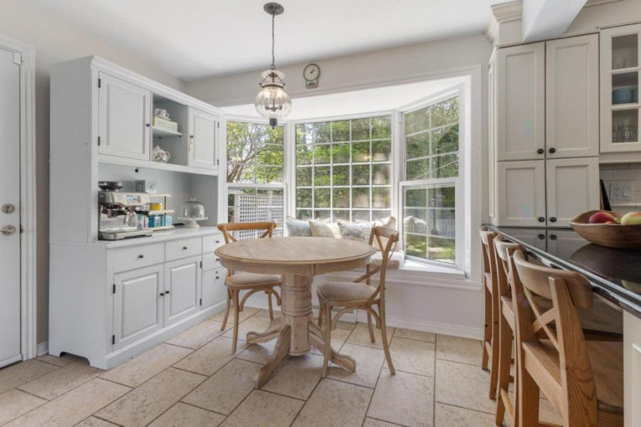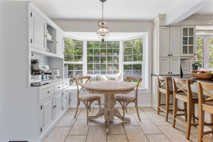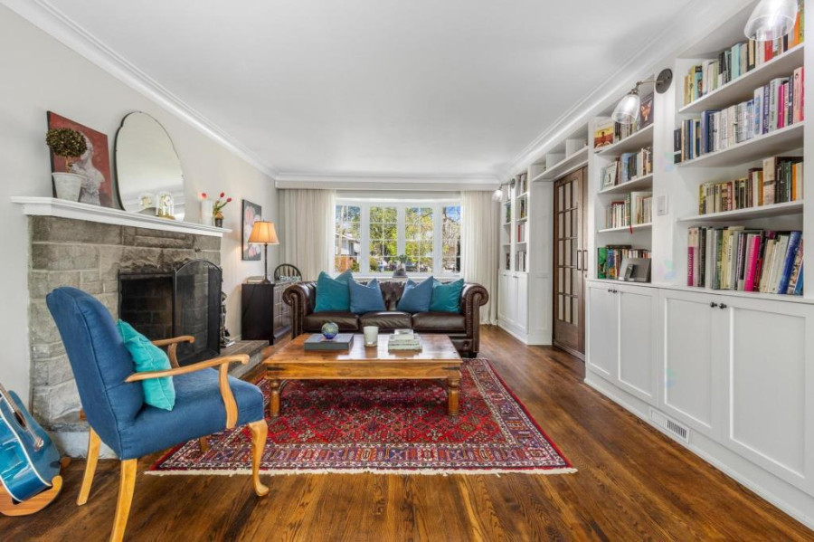 主层布局精致实用,开放式设计的厨房配备现代枫木橱柜与花岗岩台面,与温馨的家庭房及餐厅自然连通,营造出舒适的家庭生活氛围。独立的客厅可通过法式口袋门进入,内置定制书柜并配有舒适的木质壁炉,兼具优雅与私密性。此层还设有实用的化妆间,整体动线流畅,完美满足家庭日常与娱乐需求。