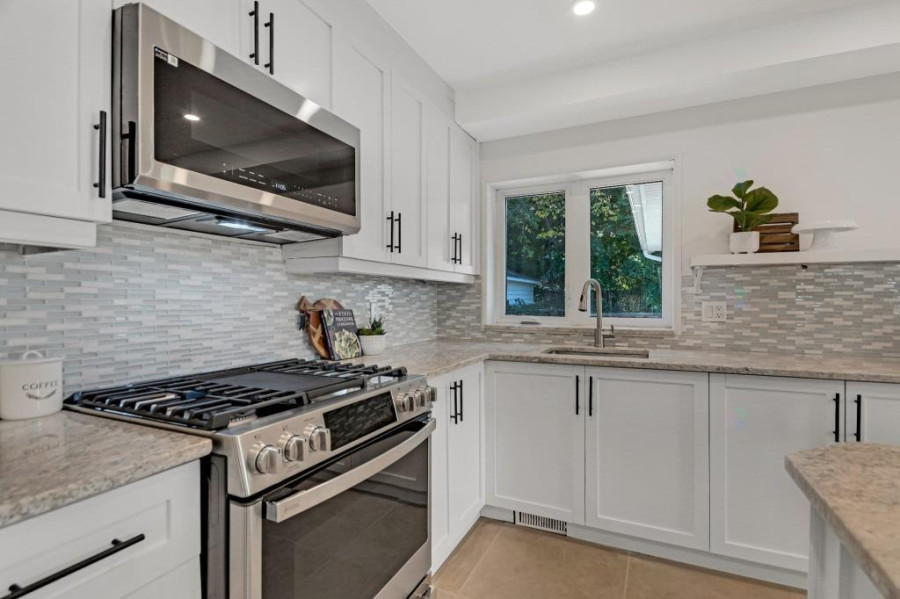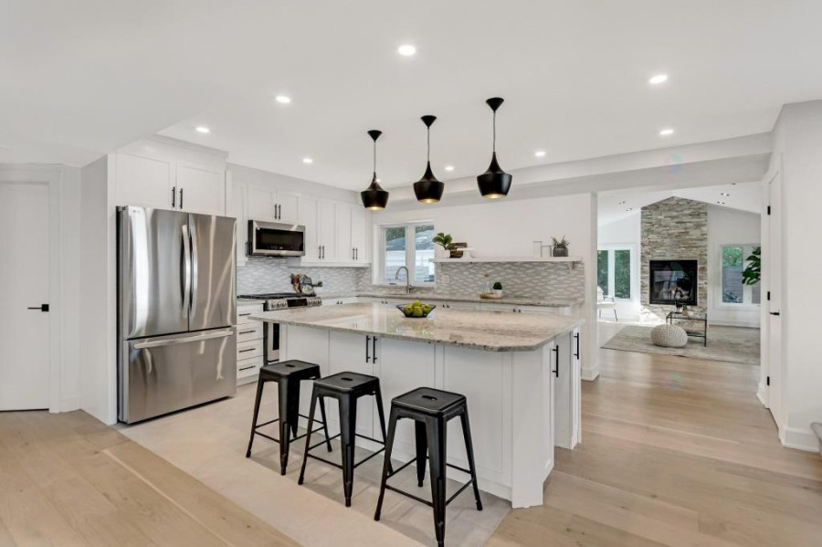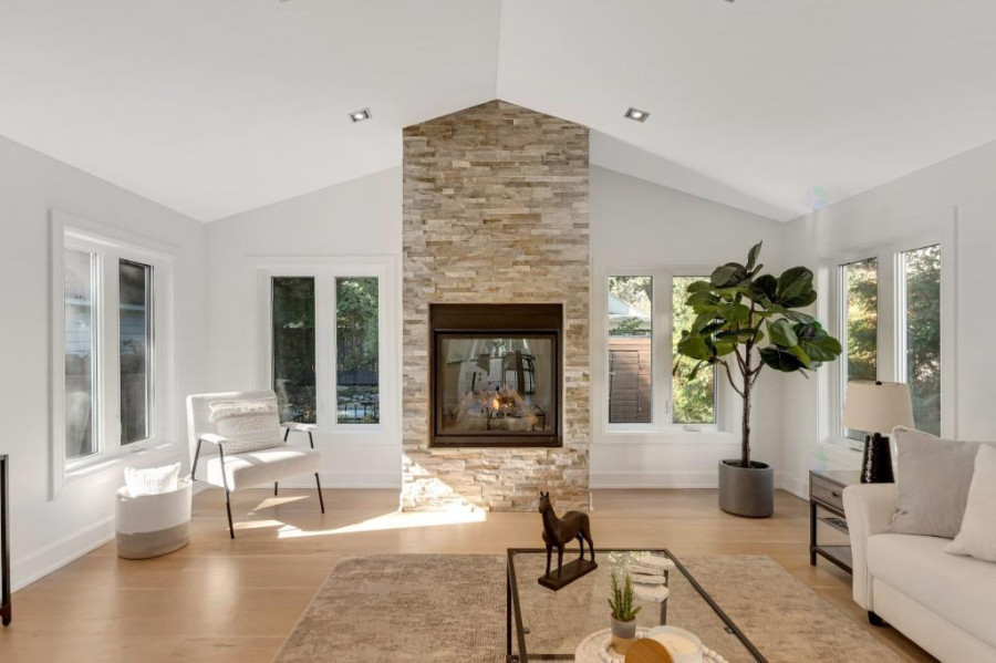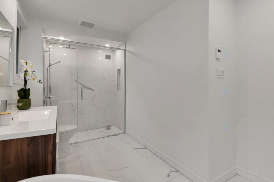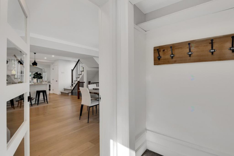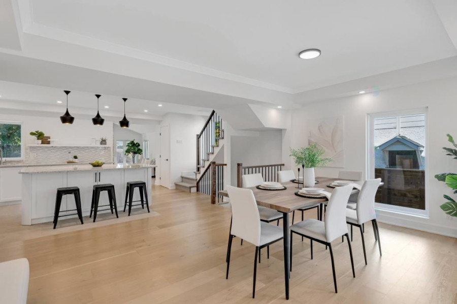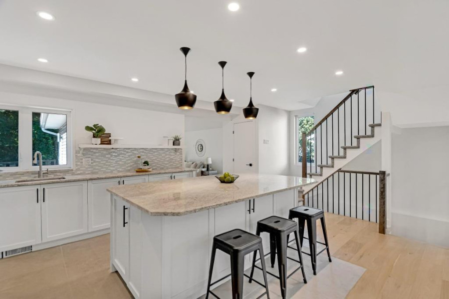 主层采用开放式布局,客厅拥有挑高天花板与壁炉,营造开阔明亮的空间感。厨房配备2025年全新家电及大型大理石中岛,兼具美观与实用性。餐厅与客厅贯通衔接,铺设实木地板,采光充沛。此层还设有一间卧室及全套浴室,适合用作客房或家庭办公室,布局灵活便捷。